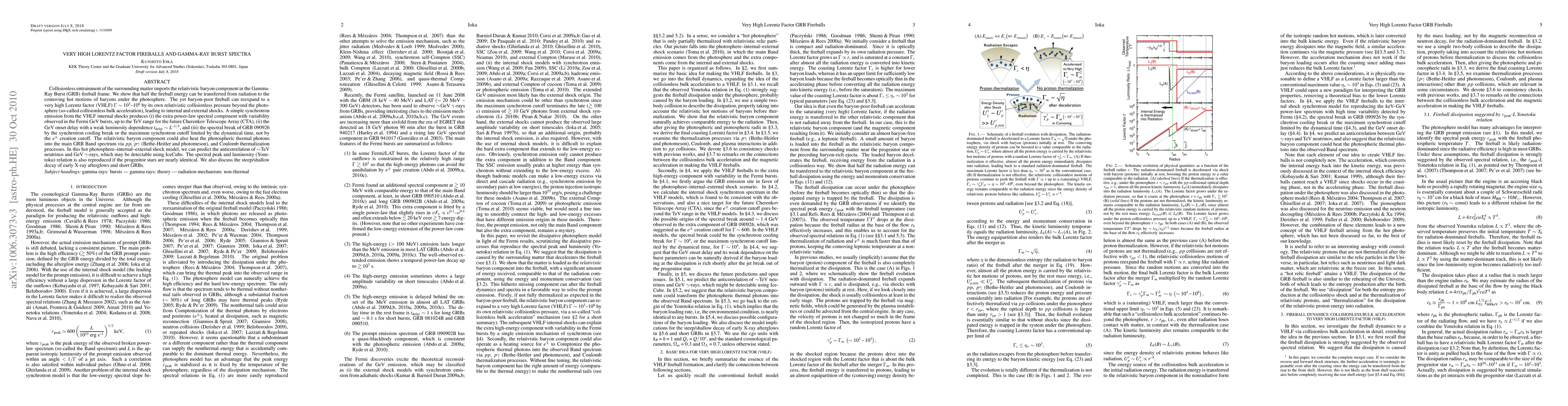 Collisionless entrainment of the surrounding matter imports the relativistic baryon component in the Gamma-Ray Burst (GRB) fireball frame. We show that half the fireball energy can be transferred from radiation to the comoving hot motions of baryons under the photosphere. The yet baryon-poor fireball can reexpand to a very high Lorentz factor (VHLF) \Gamma ~ 10^3-10^6 by its own relativistic collisionless pressure beyond the photosphere (so-called collisionless bulk acceleration), leading to internal and external shocks. A simple synchrotron emission from the VHLF internal shocks produces (i) the extra power-law spectral component with variability observed in the Fermi GeV bursts, up to the TeV range for the future Cherenkov Telescope Array (CTA), (ii) the GeV onset delay with a weak luminosity dependence t_{delay} ~ L^{-1/5}, and (iii) the spectral break of GRB 090926 by the synchrotron cooling break or the maximum synchrotron cutoff limited by the dynamical time, not by the e+- creation cutoff. The relativistic baryon component could also heat the photospheric thermal photons into the main GRB Band spectrum via pp, p\gamma (Bethe-Heitler and photomeson), and Coulomb thermalization processes. In this hot photosphere-internal-external shock model, we can predict the anticorrelation of ~TeV neutrinos and GeV gamma-rays, which may be detectable using IceCube. The spectral peak and luminosity (Yonetoku) relation is also reproduced if the progenitor stars are nearly identical. We also discuss the steep/shallow decay of early X-ray afterglows and short GRBs.