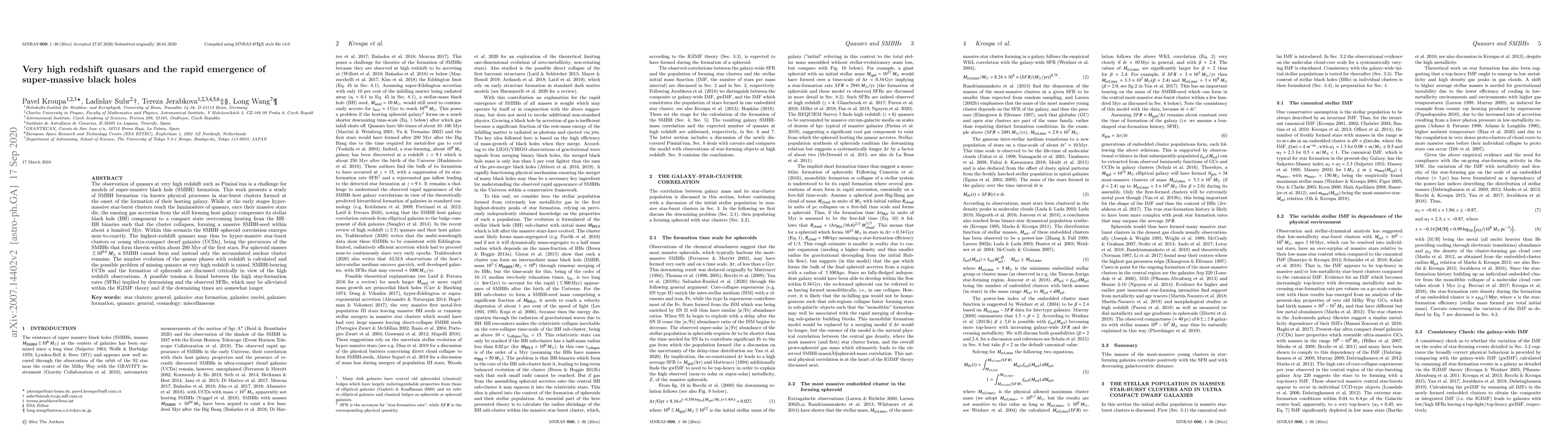 The observation of quasars at very high redshift such as Poniuaena is a challenge for models of super-massive black hole (SMBH) formation. This work presents a study of SMBH formation via known physical processes in star-burst clusters formed at the onset of the formation of their hosting galaxy. While at the early stages hyper-massive star-burst clusters reach the luminosities of quasars, once their massive stars die, the ensuing gas accretion from the still forming host galaxy compresses its stellar black hole (BH) component to a compact state overcoming heating from the BH--BH binaries such that the cluster collapses, forming a massive SMBH-seed within about a hundred Myr. Within this scenario the SMBH--spheroid correlation emerges near-to-exactly. The highest-redshift quasars may thus be hyper-massive star-burst clusters or young ultra-compact dwarf galaxies (UCDs), being the precursors of the SMBHs that form therein within about 200 Myr of the first stars. For spheroid masses <10^9.6 Msun a SMBH cannot form and instead only the accumulated nuclear cluster remains. The number evolution of the quasar phases with redshift is calculated and the possible problem of missing quasars at very high redshift is raised. SMBH-bearing UCDs and the formation of spheroids are discussed critically in view of the high redshift observations. A possible tension is found between the high star-formation rates (SFRs) implied by downsizing and the observed SFRs, which may be alleviated within the IGIMF theory and if the downsizing times are somewhat longer.