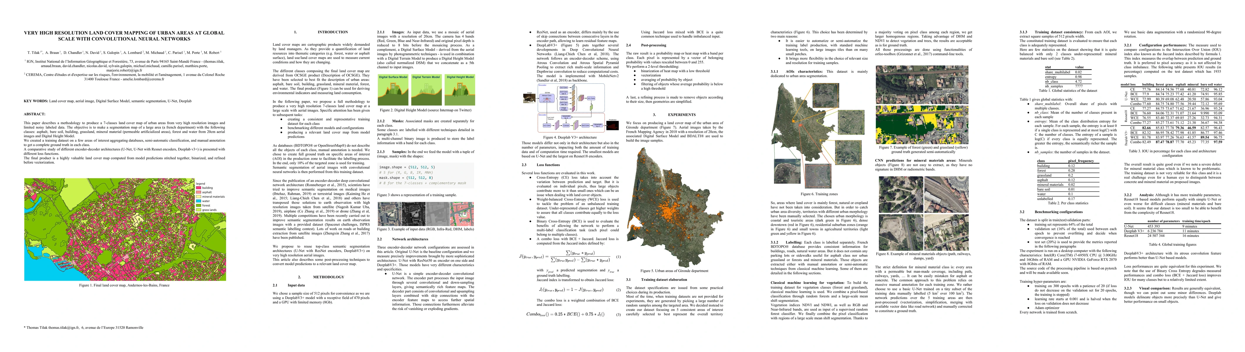 This paper presents a convolutional neural network-based methodology for producing a 7-class land cover map of urban areas from very high-resolution images, using a comparative study of different encoder-decoder architectures to achieve optimal segmentation. The final map includes classes like asphalt, forest, and water, derived from 20cm aerial images and refined through model predictions and manual annotations.
