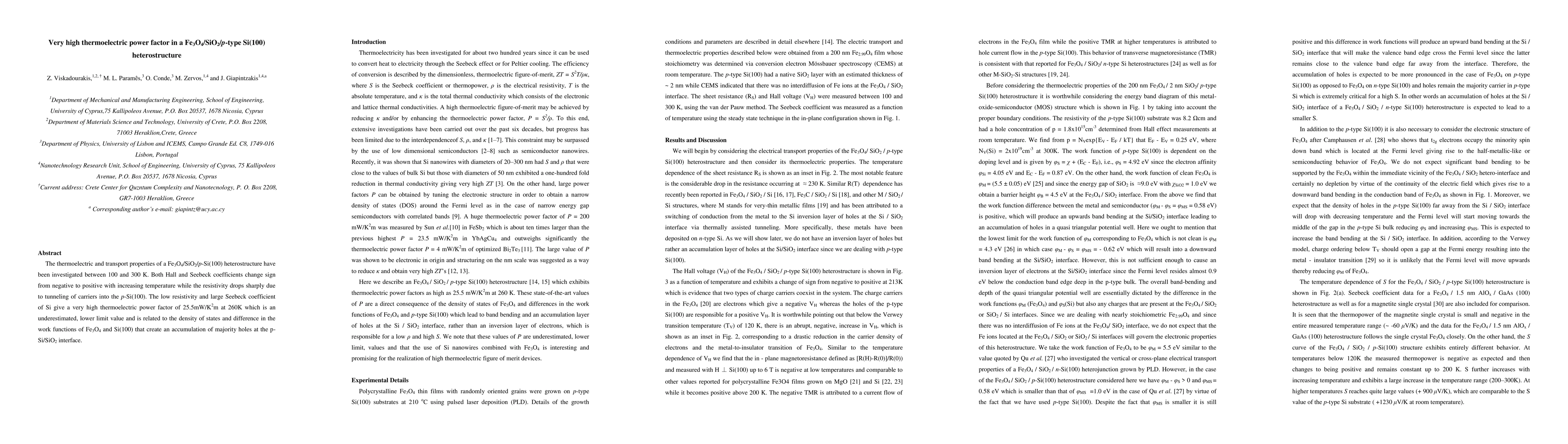 A Fe3O4/SiO2/p-Si(100) heterostructure exhibits a very high thermoelectric power factor of 25.5mW/Kcm at 260K due to carrier tunneling into p-Si(100), driven by differences in work functions between Fe3O4 and Si(100).