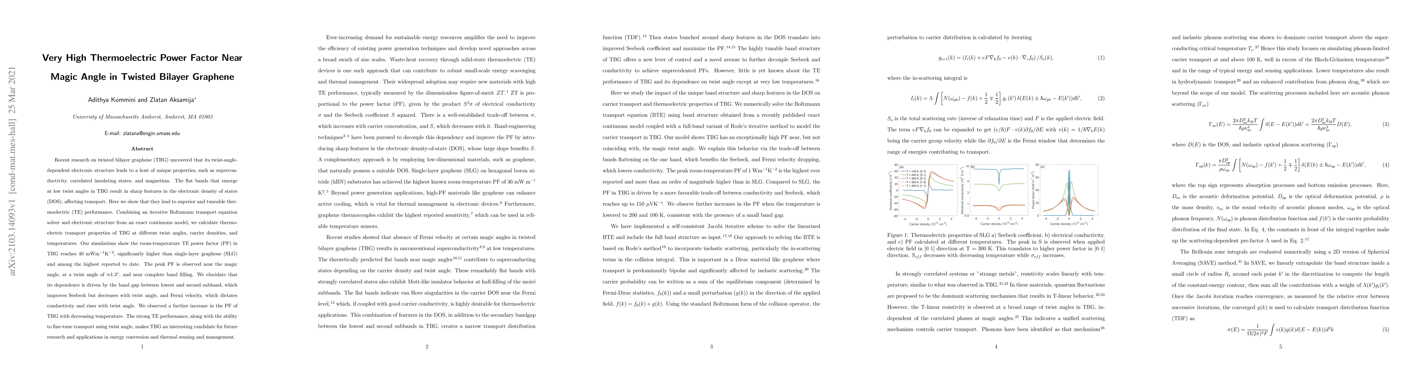 This paper investigates the thermoelectric power factor in twisted bilayer graphene (TBG) and finds it reaches 40 mWm$^{-1}$K$^{-2}$ near the magic angle, demonstrating superior thermoelectric performance compared to single-layer graphene. The peak performance is attributed to the interplay between band gap and Fermi velocity, highlighting TBG's potential for energy conversion and thermal management.