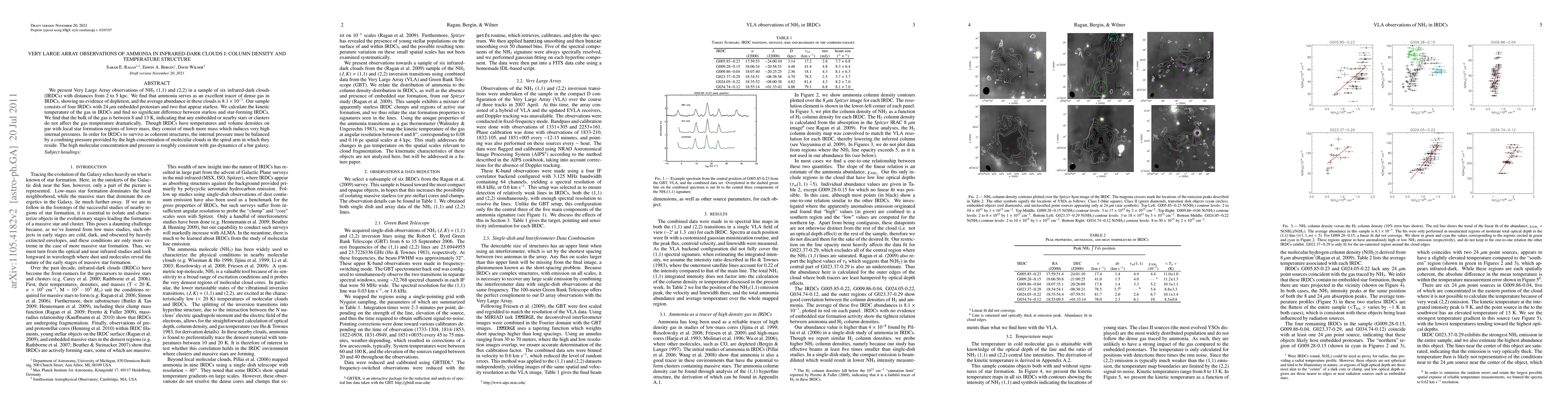 This paper reports VLA observations of ammonia in six infrared-dark clouds (IRDCs), revealing that ammonia is an effective tracer of dense gas with no evidence of depletion. The study finds similar kinetic temperatures in both starless and star-forming IRDCs, suggesting that embedded stars do not significantly affect the gas temperature.