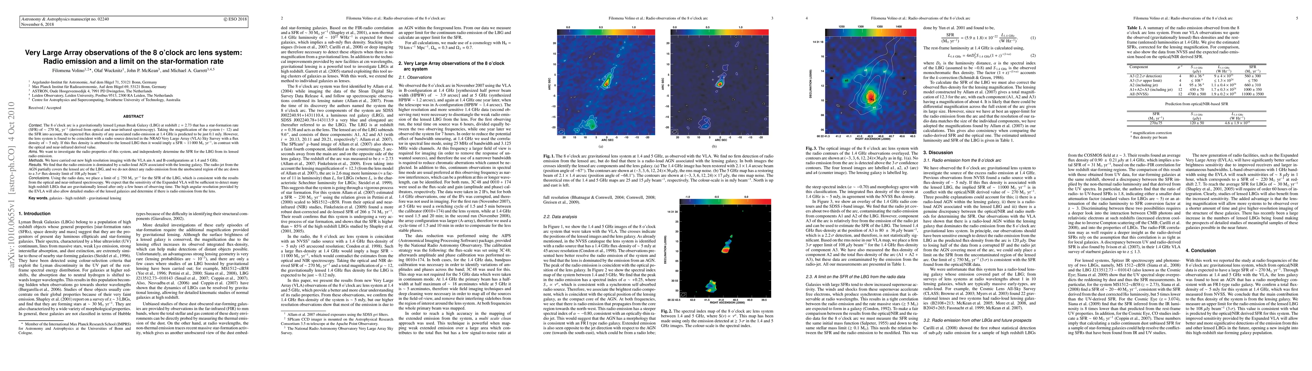 The 8 o'clock arc is a gravitationally lensed Lyman Break Galaxy (LBG) at redshift z=2.73 that has a star-formation rate (SFR) of 270 solar-mass/year (derived from optical and near-infrared spectroscopy). Taking the magnification of the system ~12 and the SFR into account, the expected flux density of any associated radio emission at 1.4 GHz is predicted to be just 0.1 mJy. However, the lens system is found to be coincident with a radio source detected in the NRAO Very Large Array (VLA) Sky Survey with a flux density of ~5 mJy. If this flux density is attributed to the lensed LBG then it would imply a SFR ~11000 solar-mass/year, in contrast with the optical and near-infrared derived value. We want to investigate the radio properties of this system, and independently determine the SFR for the LBG from its lensed radio emission. We have carried out new high resolution imaging with the VLA ain A and B-configurations at 1.4 and 5 GHz. We find that the radio emission is dominated by a radio-loud AGN associated with the lensing galaxy. The radio-jet from the AGN partially covers the lensed arc of the LBG, and we do not detect any radio emission from the unobscured region of the arc down to a 3 sigma flux-density limit of 108 micro-Jy/beam. Using the radio data, we place a limit of <750 solar-mass/year for the SFR of the LBG, which is consistent with the results from the optical and near-infrared spectroscopy. We expect that the sensitivity of the Expanded VLA will be sufficient to detect many high redshift LBGs that are gravitationally lensed after only a few hours of observing time. The high angular resolution provided by the EVLA will also allow detailed studies of the lensed galaxies and determine if there is radio emission from the lens.