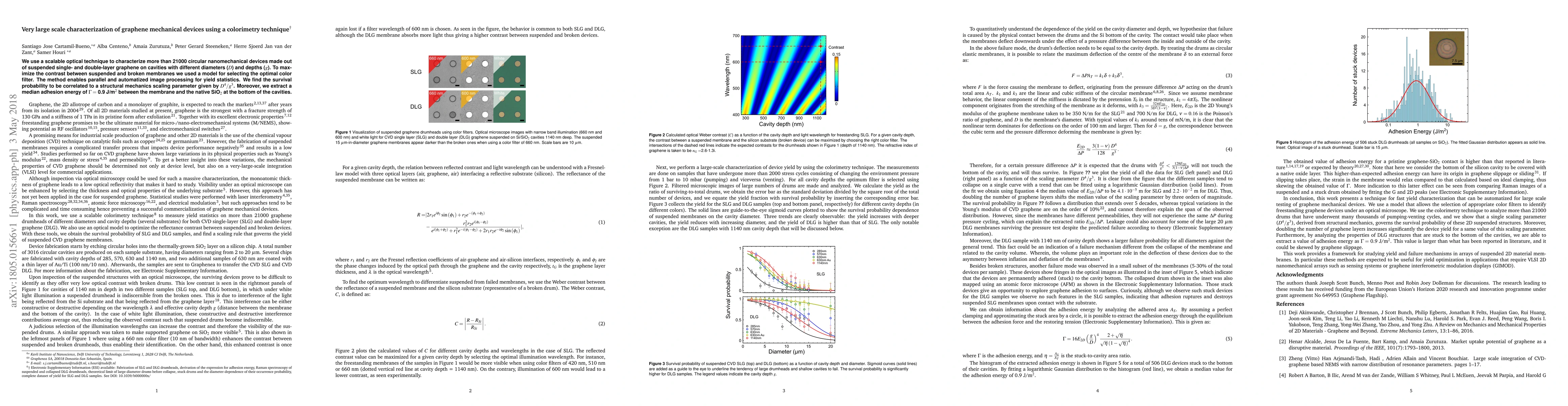 We use a scalable optical technique to characterize more than 21000 circular nanomechanical devices made out of suspended single- and double-layer graphene on cavities with different diameters ($D$) and depths ($g$). To maximize the contrast between suspended and broken membranes we used a model for selecting the optimal color filter. The method enables parallel and automatized image processing for yield statistics. We find the survival probability to be correlated to a structural mechanics scaling parameter given by $D^4/g^3$. Moreover, we extract a median adhesion energy of $\Gamma =$ 0.9 J/m$^2$ between the membrane and the native SiO$_2$ at the bottom of the cavities.