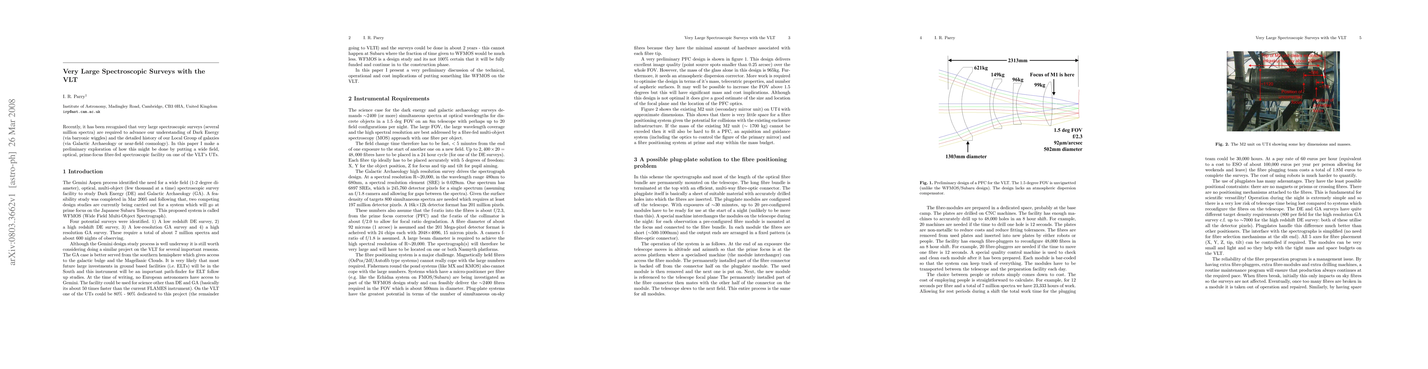 This paper explores the feasibility of conducting very large spectroscopic surveys using a wide-field, optical, prime-focus fibre-fed spectrograph on the VLT's UTs to advance understanding of Dark Energy and the Local Group's history. The study proposes a preliminary design for such a facility.