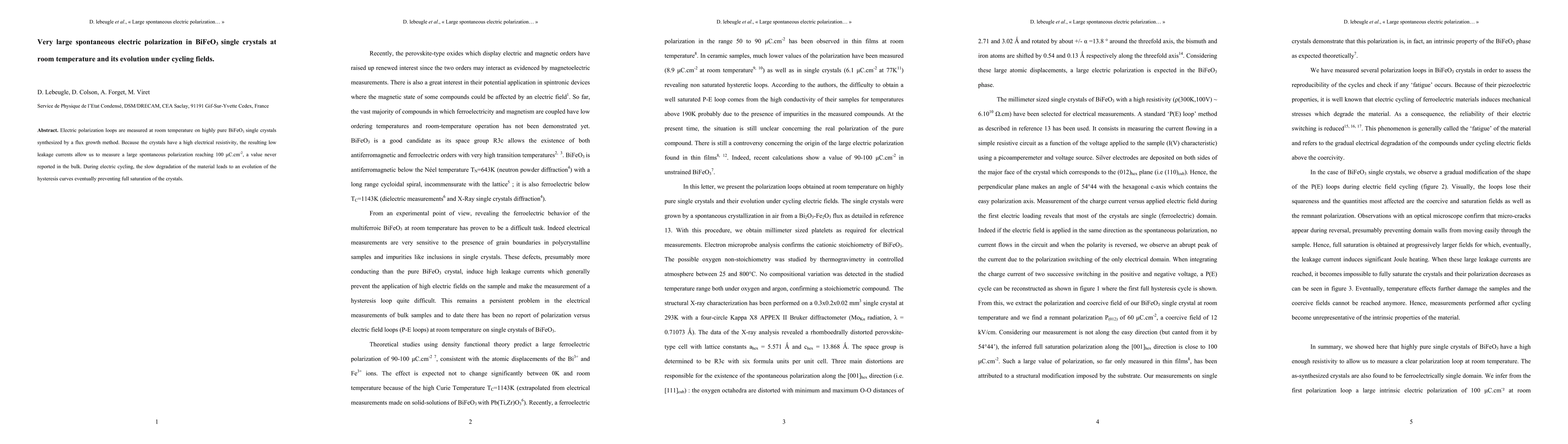 This study reports a large spontaneous electric polarization of 100 microC.cm^{-2} in highly pure BiFeO3 single crystals at room temperature, achieved due to low leakage currents. Over cycling fields, the material's hysteresis curves degrade, eventually hindering full saturation.