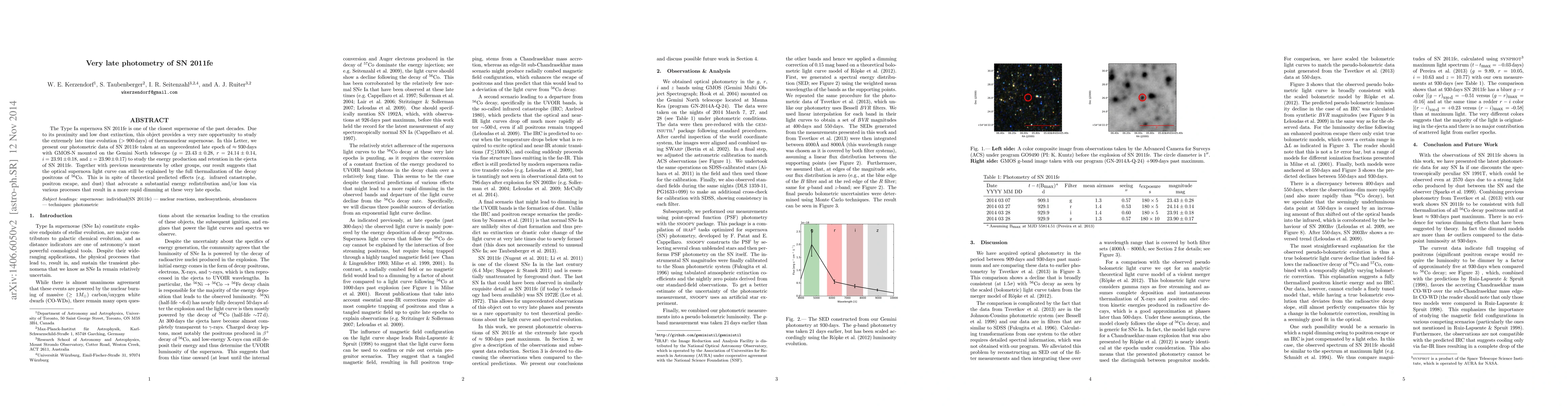 The Type Ia supernova SN 2011fe is one of the closest supernovae of the past decades. Due to its proximity and low dust extinction, this object provides a very rare opportunity to study the extremely late time evolution ($>900$ days) of thermonuclear supernovae. In this Letter, we present our photometric data of SN 2011fe taken at an unprecedented late epoch of $\approx 930$ days with GMOS-N mounted on the Gemini North telescope ($g=23.43 \pm 0.28$, $r=24.14 \pm 0.14$, $i=23.91 \pm 0.18$, and $z=23.90 \pm 0.17$) to study the energy production and retention in the ejecta of SN 2011fe. Together with previous measurements by other groups, our result suggests that the optical supernova light curve can still be explained by the full thermalization of the decay positrons of Co56. This is in spite of theoretical predicted effects (e.g. infrared catastrophe, positron escape, and dust) that advocate a substantial energy redistribution and/or loss via various processes that result in a more rapid dimming at these very late epochs.
