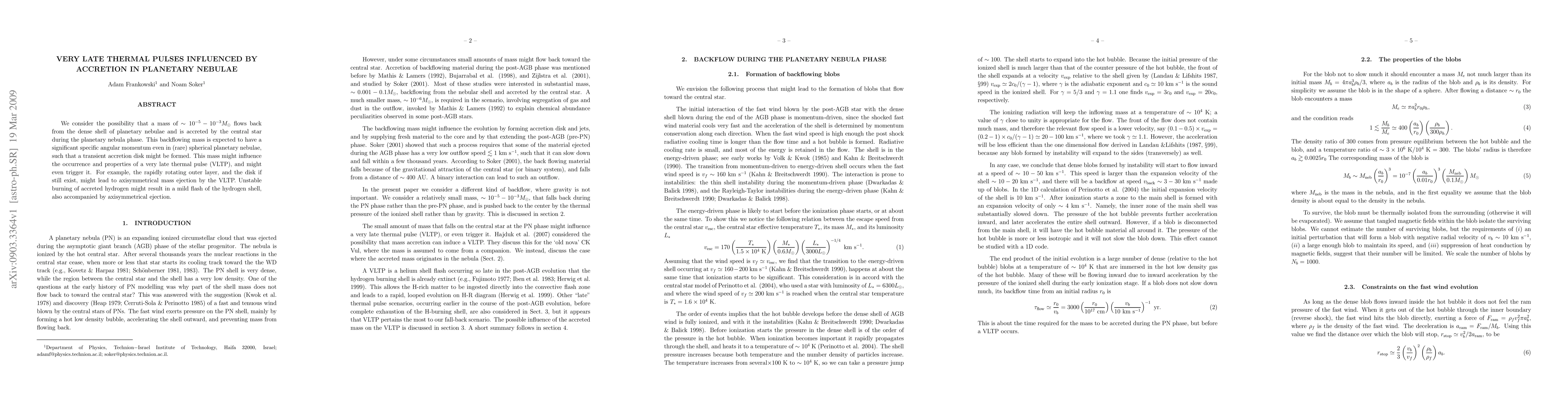 We consider the possibility that a mass of ~10^{-5}-10^{-3} Msun flows back from the dense shell of planetary nebulae and is accreted by the central star during the planetary nebula phase. This backflowing mass is expected to have a significant specific angular momentum even in (rare) spherical planetary nebulae, such that a transient accretion disk might be formed. This mass might influence the occurrence and properties of a very late thermal pulse (VLTP), and might even trigger it. For example, the rapidly rotating outer layer, and the disk if still exist, might lead to axisymmetrical mass ejection by the VLTP. Unstable burning of accreted hydrogen might result in a mild flash of the hydrogen shell, also accompanied by axisymmetrical ejection.