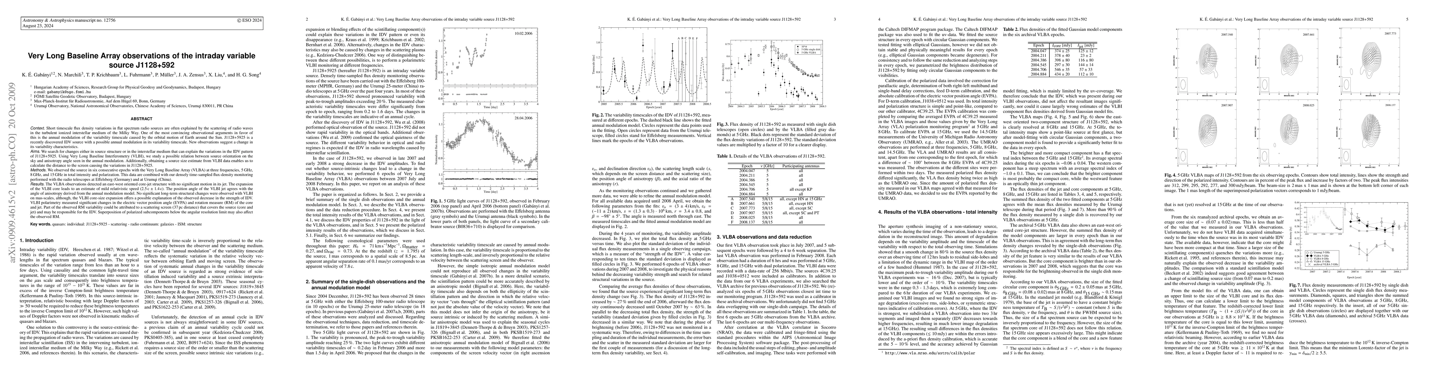 Short time-scale flux density variations of flat spectrum radio sources are often explained by the scattering of radio waves in the turbulent, ionized Interstellar Matter of the Milky Way. One of the most convincing observational arguments in favor of this is the annual modulation of the variability time-scale caused by the Earth orbital motion around the Sun. J1128+592 is an IDV source with a possible annual modulation in its variability time-scale. We observed the source in 6 epochs with the VLBA at 5, 8 and 15 GHz in total intensity and polarization. The VLBA observations revealed an east-west oriented core-jet structure. Its position angle agrees with the angle of anisotropy derived from the annual modulation model. No significant long-term structural changes were observed with VLBI on mas-scales, however, compared to archival data, the VLBI core size is expanded. This expansion offers a possible explanation to the observed decrease of the strength of IDV. VLBI polarimetry revealed significant changes in the electric vector position angle and Rotation Measure of the core and jet. Part of the observed RM variability could be attributed to a scattering screen (37 pc distance), which covers the source (core and jet) and which may be responsible for the IDV. Superposition of polarized sub-components below the angular resolution limit may affect the observed RM as well.