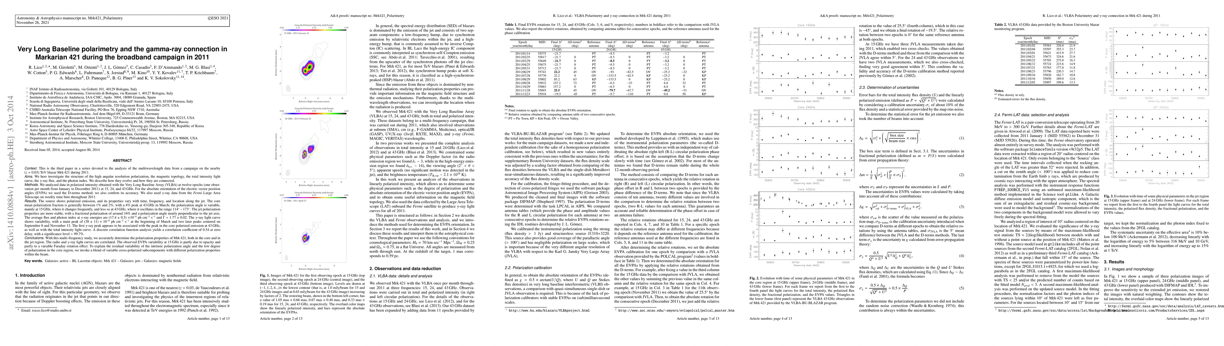 We analyzed data in polarized intensity obtained with the Very Long Baseline Array (VLBA) at twelve epochs (one observation per month from January to December 2011) at 15, 24, and 43 GHz. For the absolute orientation of the electric vector position angles (EVPA) we used the D-terms method. We also used gamma-ray data from the Fermi Large Area Telescope on weekly time bins throughout 2011. The source shows polarized emission, and its properties vary with time, frequency, and location along the jet. The core mean polarization fraction is generally between 1% and 2%, with a 4% peak at 43 GHz in March; the polarization angle is variable, mainly at 15 GHz, where it changes frequently, and less so at 43 GHz, where it oscillates in the range 114 - 173 deg. The jet polarization properties are more stable, with a fractional polarization of around 16% and a polarization angle nearly perpendicular to the jet axis. The average flux and photon index at gamma-ray energies are (17.7+-0.5)x10^8 ph cm^-2 s^-1 and the photon index is 1.77+-0.02. The gamma-ray light curve shows variability, with a main peak that appears to be associated with the peak in the core polarized emission at 43 GHz, as well as with the total intensity light curve. A discrete correlation function analysis yields a correlation coefficient of 0.54 at zero delay, with a significance level above 99.7%. We accurately determine the polarization properties of Mrk 421, both in the core and in the jet region. The radio and gamma-ray light curves are correlated. The observed EVPA variability at 15 GHz is partly due to opacity and partly to a variable Faraday rotation effect. To explain the residual variability of the intrinsic polarization angle and the low degree of polarization in the core region, we invoke a blend of variable cross-polarized subcomponents with different polarization properties within the beam.