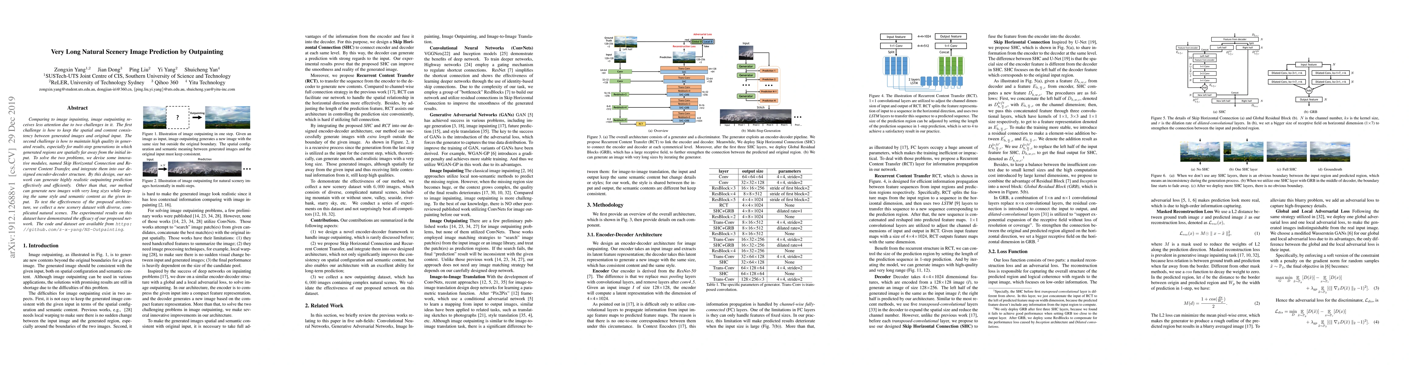 Comparing to image inpainting, image outpainting receives less attention due to two challenges in it. The first challenge is how to keep the spatial and content consistency between generated images and original input. The second challenge is how to maintain high quality in generated results, especially for multi-step generations in which generated regions are spatially far away from the initial input. To solve the two problems, we devise some innovative modules, named Skip Horizontal Connection and Recurrent Content Transfer, and integrate them into our designed encoder-decoder structure. By this design, our network can generate highly realistic outpainting prediction effectively and efficiently. Other than that, our method can generate new images with very long sizes while keeping the same style and semantic content as the given input. To test the effectiveness of the proposed architecture, we collect a new scenery dataset with diverse, complicated natural scenes. The experimental results on this dataset have demonstrated the efficacy of our proposed network. The code and dataset are available from https://github.com/z-x-yang/NS-Outpainting.