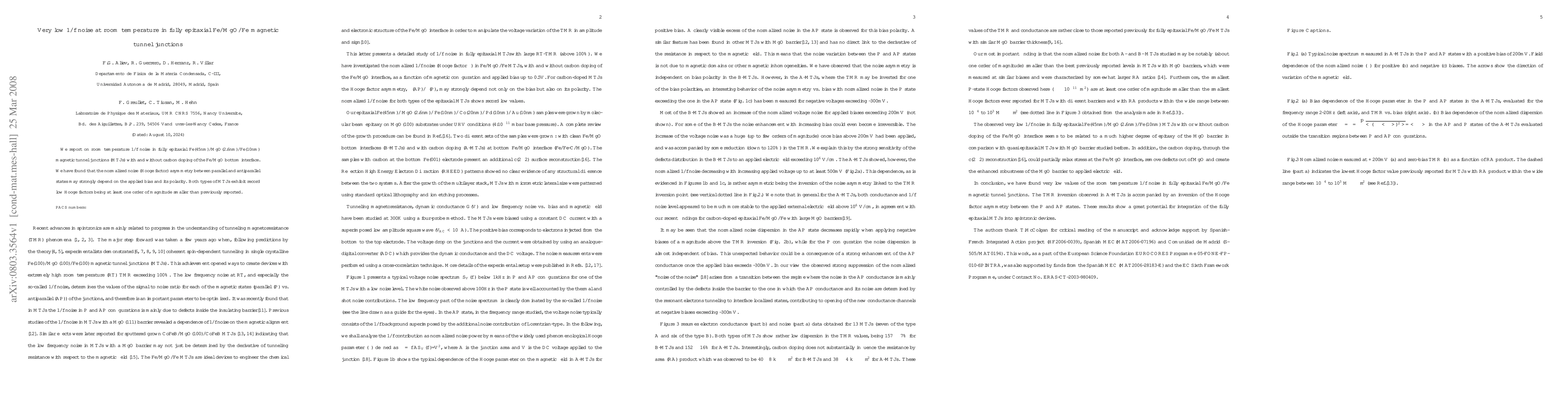 This study reports on the very low 1/f noise at room temperature in fully epitaxial Fe/MgO/Fe magnetic tunnel junctions, revealing record-low Hooge factors, at least one order of magnitude smaller than previously reported, with notable dependence on applied bias polarity and carbon doping of the Fe/MgO interface.