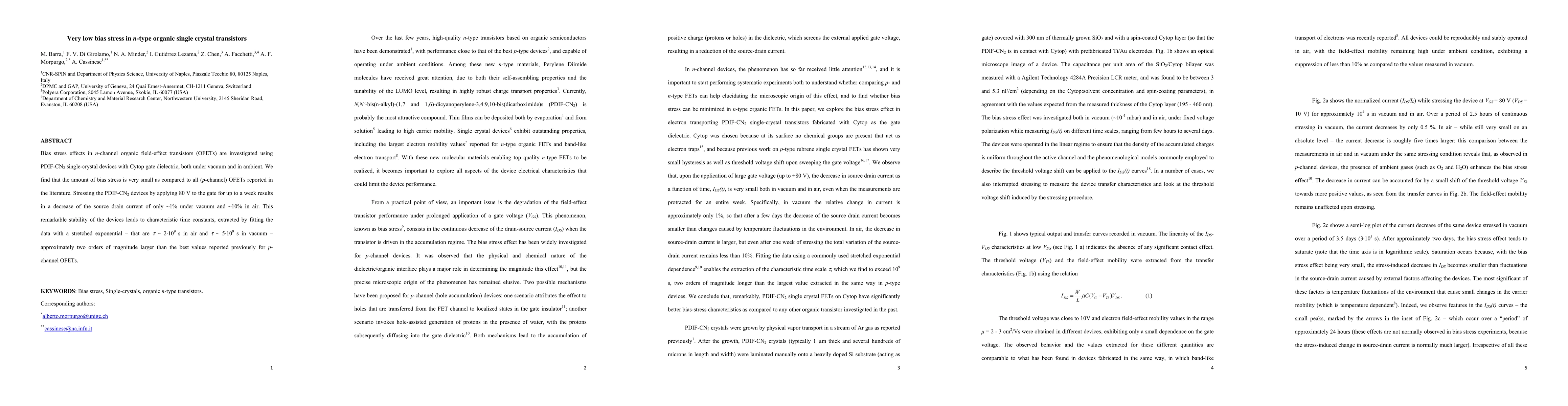 This research investigates bias stress in n-type organic single crystal transistors using PDIF-CN2 devices with Cytop gate dielectric under vacuum and ambient conditions. Key findings include minimal bias stress, with source-drain current decreasing by only ~1% in vacuum and ~10% in air after one week of stressing with 80V gate voltage. This stability results in exceptionally large characteristic time constants, approximately two orders of magnitude greater than previously reported for p-channel OFETs.