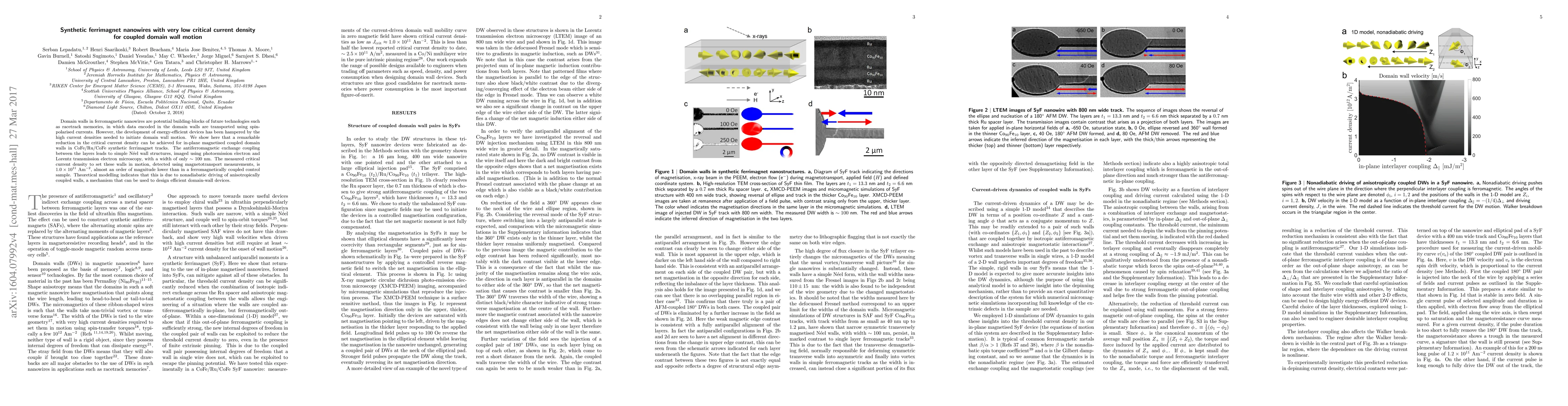 This paper demonstrates a significant reduction in the critical current density for coupled domain wall motion in synthetic ferrimagnet nanowires, achieving a value of $1.0 \times 10^{11}$~Am$^{-2}$, nearly an order of magnitude lower than in ferromagnetically coupled samples. The antiferromagnetic coupling and nonadiabatic driving mechanisms are identified as key factors for this efficiency.