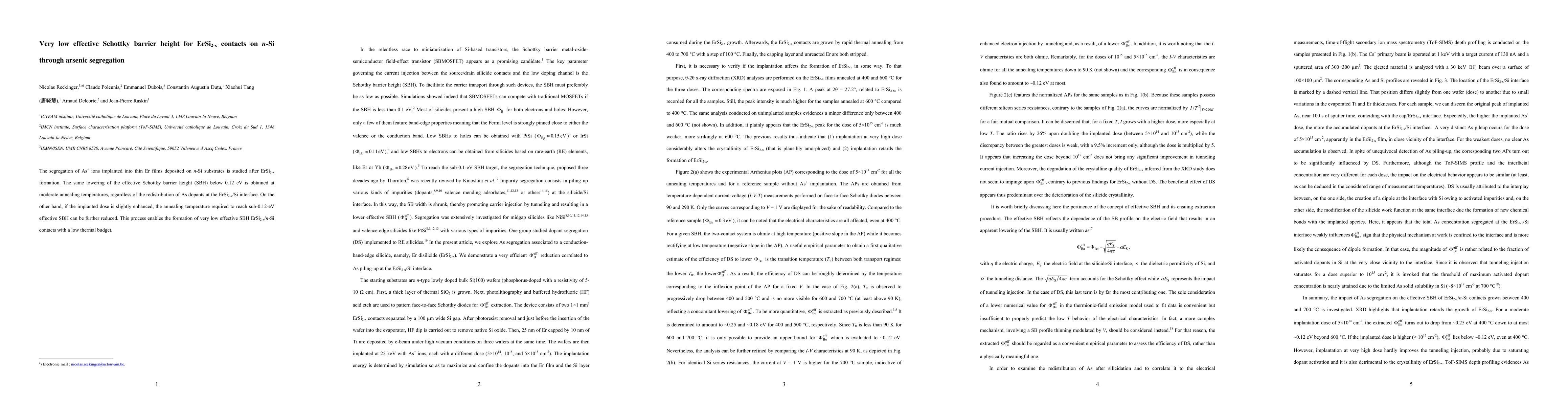 The segregation of As+ ions implanted into thin Er films deposited on n-Si substrates is studied after ErSi2-x formation. The same lowering of the effective Schottky barrier height (SBH) below 0.12 eV is obtained at moderate annealing temperatures, regardless of the redistribution of As dopants at the ErSi2-x/Si interface. On the other hand, if the implanted dose is slightly enhanced, the annealing temperature required to reach sub-0.12-eV effective SBH can be further reduced. This process enables the formation of very low effective SBH ErSi2-x/n-Si contacts with a low thermal budget.