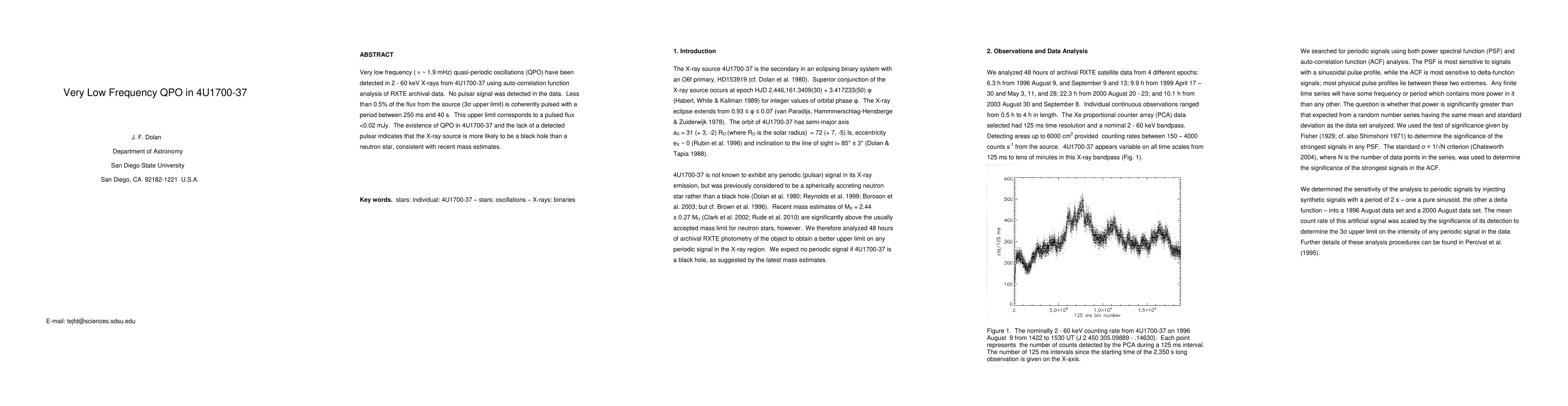 Very low frequency ({\nu} ~ 1.9 mHz) quasi-periodic oscillations (QPO) have been detected in 2 - 60 keV X-rays from 4U1700-37 using auto-correlation function analysis of RXTE archival data. No pulsar signal was detected in the data. Less than 0.5% of the flux from the source (3{\sigma} upper limit) is coherently pulsed with a period between 250 ms and 40 s. This upper limit corresponds to a pulsed flux <0.02 mJy. The existence of QPO in 4U1700-37 and the lack of a detected pulsar indicates that the X-ray source is more likely to be a black hole than a neutron star, consistent with recent mass estimates.