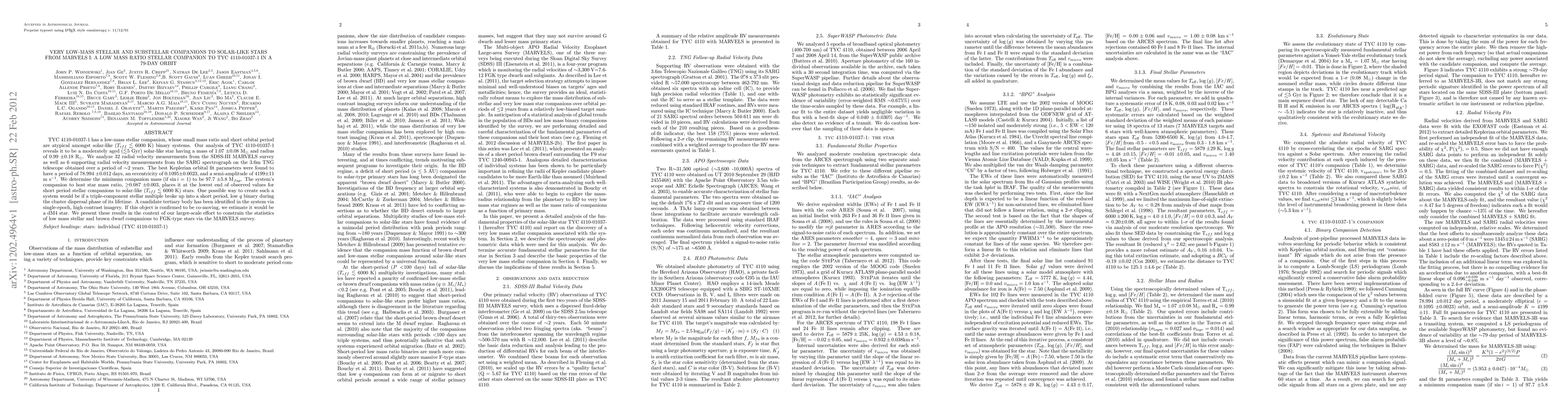 TYC 4110-01037-1 has a low-mass stellar companion, whose small mass ratio and short orbital period are atypical amongst solar-like (Teff ~< 6000 K) binary systems. Our analysis of TYC 4110-01037-1 reveals it to be a moderately aged (~<5 Gyr) solar-like star having a mass of 1.07 +/- 0.08 MSun and radius of 0.99 +/- 0.18 RSun. We analyze 32 radial velocity measurements from the SDSS-III MARVELS survey as well as 6 supporting radial velocity measurements from the SARG spectrograph on the 3.6m TNG telescope obtained over a period of ~2 years. The best Keplerian orbital fit parameters were found to have a period of 78.994 +/- 0.012 days, an eccentricity of 0.1095 +/- 0.0023, and a semi-amplitude of 4199 +/- 11 m/s. We determine the minimum companion mass (if sin i = 1) to be 97.7 +/- 5.8 MJup. The system's companion to host star mass ratio, >0.087 +/- 0.003, places it at the lowest end of observed values for short period stellar companions to solar-like (Teff ~< 6000 K) stars. One possible way to create such a system would be if a triple-component stellar multiple broke up into a short period, low q binary during the cluster dispersal phase of its lifetime. A candidate tertiary body has been identified in the system via single-epoch, high contrast imagery. If this object is confirmed to be co-moving, we estimate it would be a dM4 star. We present these results in the context of our larger-scale effort to constrain the statistics of low mass stellar and brown dwarf companions to FGK-type stars via the MARVELS survey.