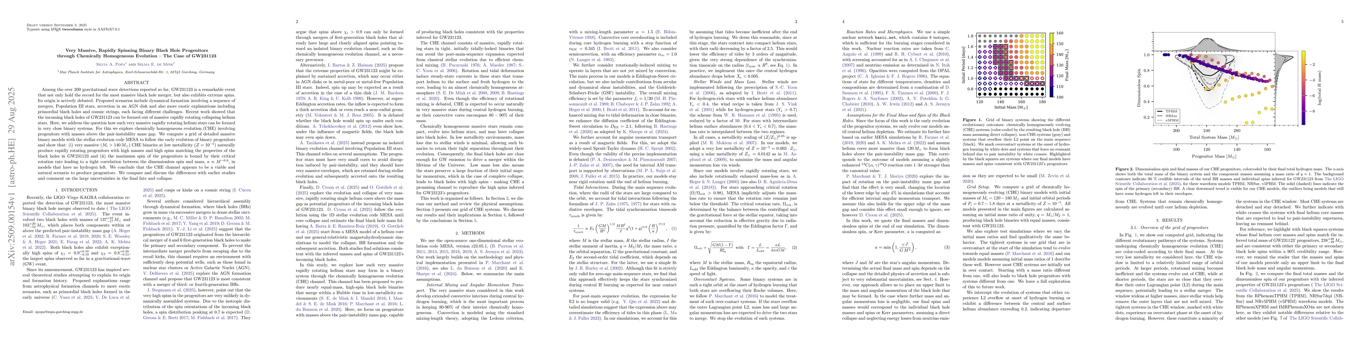 Among the over 200 gravitational wave detections reported so far, GW231123 is a remarkable event that not only holds the record for the most massive black hole merger, but also exhibits extreme spins. Its origin is actively debated. Proposed scenarios include dynamical formation involving a sequence of mergers, Population III stars, accretion in an AGN disk and also more exotic explanations including primordial black holes and cosmic strings, each facing different challenges. Recent work showed that the incoming black holes of GW231123 can be formed out of massive rapidly rotating collapsing helium stars. Here, we address the question how such very massive rapidly rotating helium stars can be formed in very close binary systems. For this we explore chemically homogeneous evolution (CHE) involving progenitors with masses above the pair-instability mass gap. We compute a grid of detailed massive binary models with the stellar evolution code MESA to follow the early evolution of binary progenitors and show that: (i) very massive ($M_i > 140\, M_\odot$) CHE binaries at low metallicity ($Z=10^{-5}$) naturally produce rapidly rotating progenitors with high masses and high spins matching the properties of the black holes in GW231123 and (ii) the maximum spin of the progenitors is bound by their critical rotation rate leading to a tight correlation between the dimensionless spin and mass, $a \propto M^{-0.9}$, in models that have no hydrogen left. We conclude that the CHE channel appears to be a viable and natural scenario to produce progenitors. We compare and discuss the differences with earlier studies and comment on the large uncertainties in the final fate and collapse.