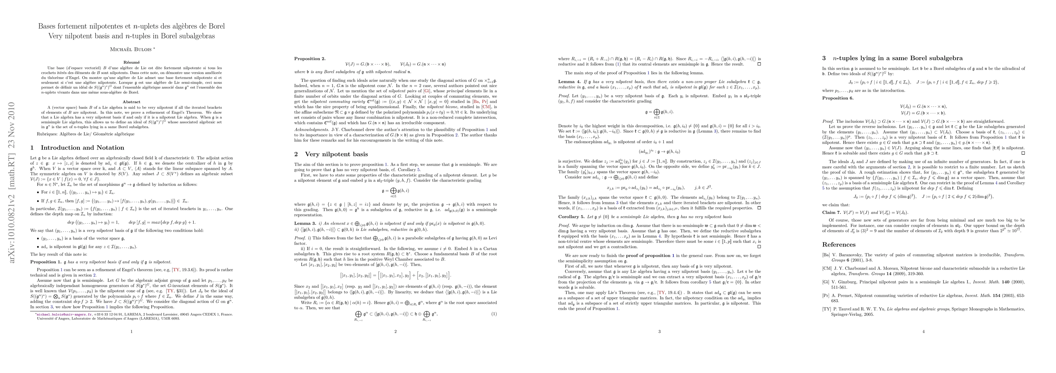 A (vector space) basis B of a Lie algebra is said to be very nilpotent if all the iterated brackets of elements of B are nilpotent. In this note, we prove a refinement of Engel's Theorem. We show that a Lie algebra has a very nilpotent basis if and only if it is a nilpotent Lie algebra. When g is a semisimple Lie algebra, this allows us to define an ideal of S((g^n)^*)^G whose associated algebraic set in g^n is the set of n-tuples lying in a same Borel subalgebra.