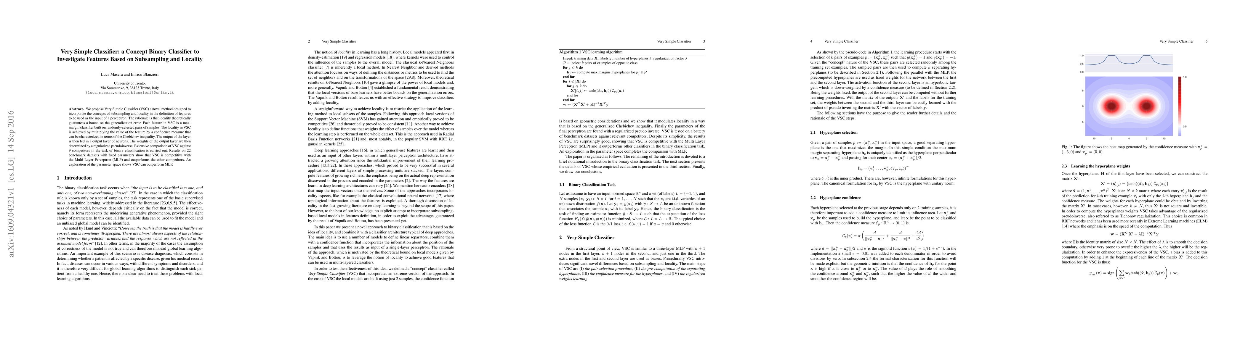 We propose Very Simple Classifier (VSC) a novel method designed to incorporate the concepts of subsampling and locality in the definition of features to be used as the input of a perceptron. The rationale is that locality theoretically guarantees a bound on the generalization error. Each feature in VSC is a max-margin classifier built on randomly-selected pairs of samples. The locality in VSC is achieved by multiplying the value of the feature by a confidence measure that can be characterized in terms of the Chebichev inequality. The output of the layer is then fed in a output layer of neurons. The weights of the output layer are then determined by a regularized pseudoinverse. Extensive comparison of VSC against 9 competitors in the task of binary classification is carried out. Results on 22 benchmark datasets with fixed parameters show that VSC is competitive with the Multi Layer Perceptron (MLP) and outperforms the other competitors. An exploration of the parameter space shows VSC can outperform MLP.