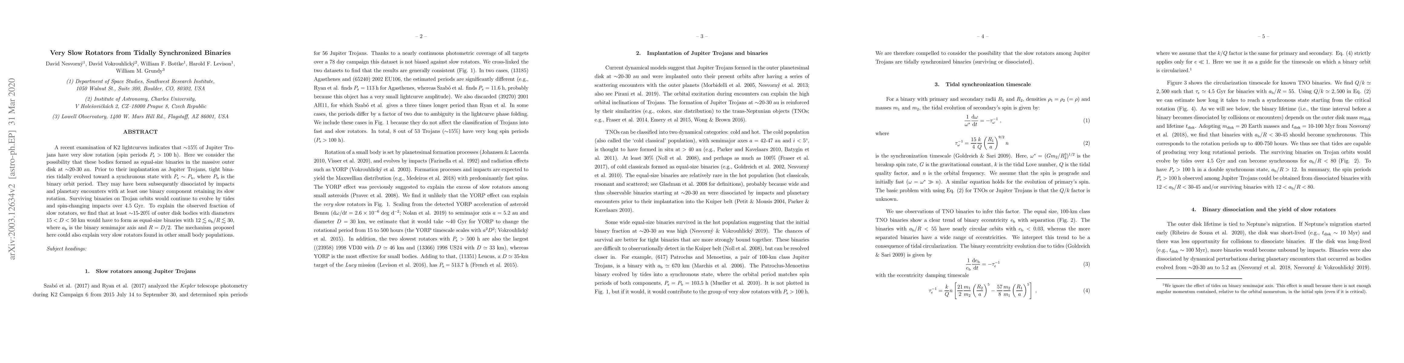 About 15% of Jupiter Trojans have very slow rotation periods due to tidal evolution from equal-size binary systems in the outer disk, suggesting a new formation mechanism.