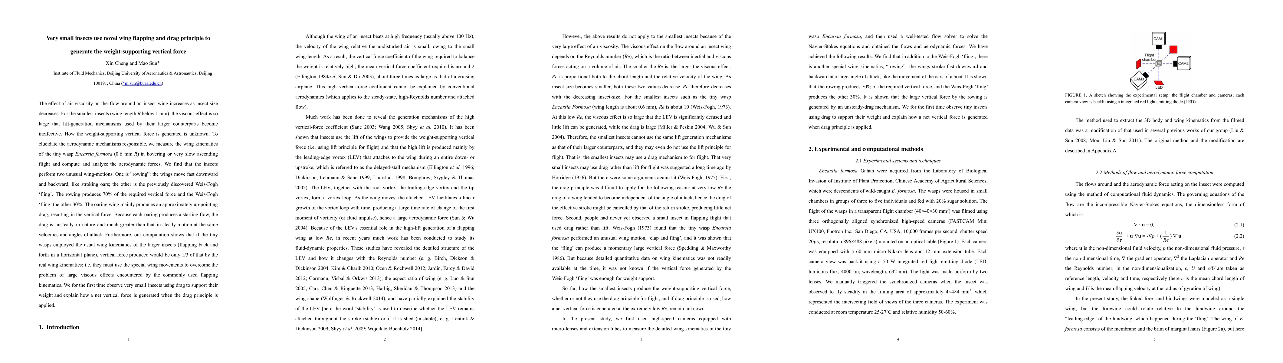 This study reveals that tiny wasps like Encarsia formosa generate weight-supporting vertical force through novel wing-flapping techniques, primarily rowing and the Weis-Fogh fling, which produce up to 70% and 30% of the required vertical force, respectively. These unique movements overcome the large viscous effects that hinder traditional lift-generation mechanisms in small insects.