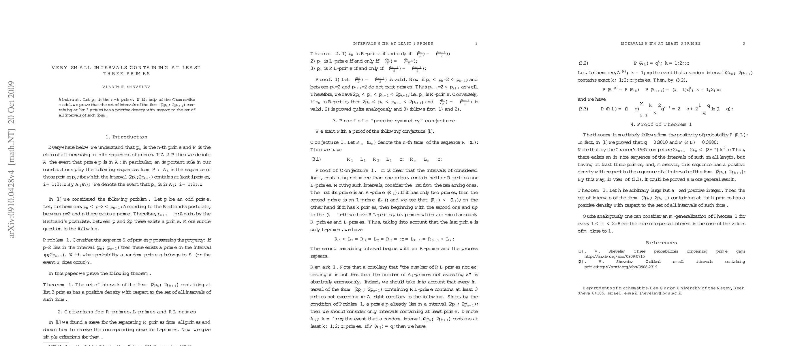 Let $p_n$ is the $n$-th prime. With help of the Cram\'er-like model, we prove that the set of intervals of the form $(2p_n,\enskip2p_{n+1})$ containing at list 3 primes has a positive density with respect to the set of all intervals of such form.