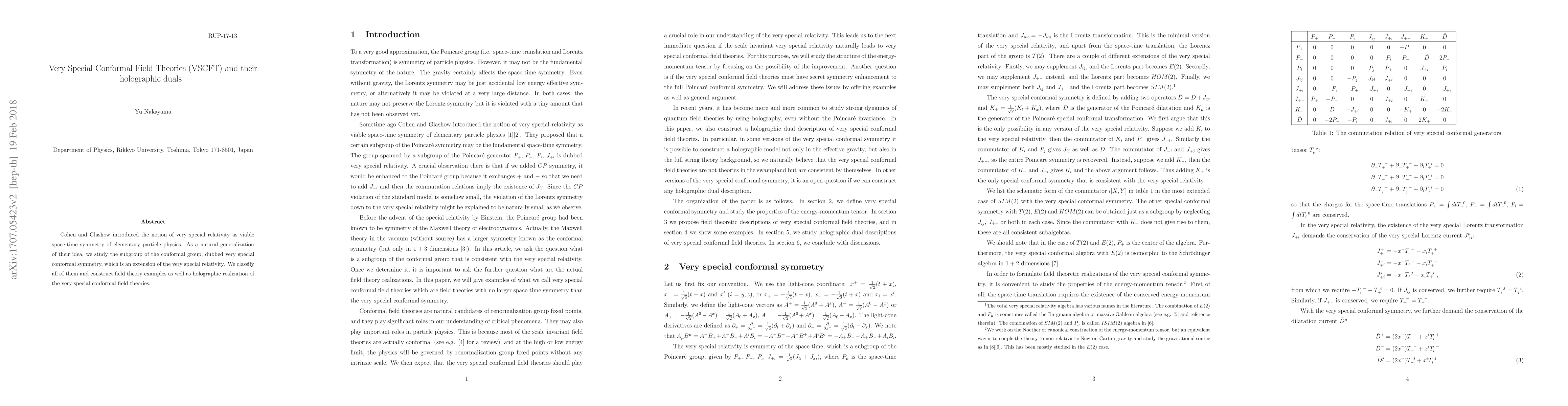 This paper classifies the subgroup of the conformal group known as very special conformal symmetry and constructs corresponding field theories. It also provides holographic duals for these very special conformal field theories.