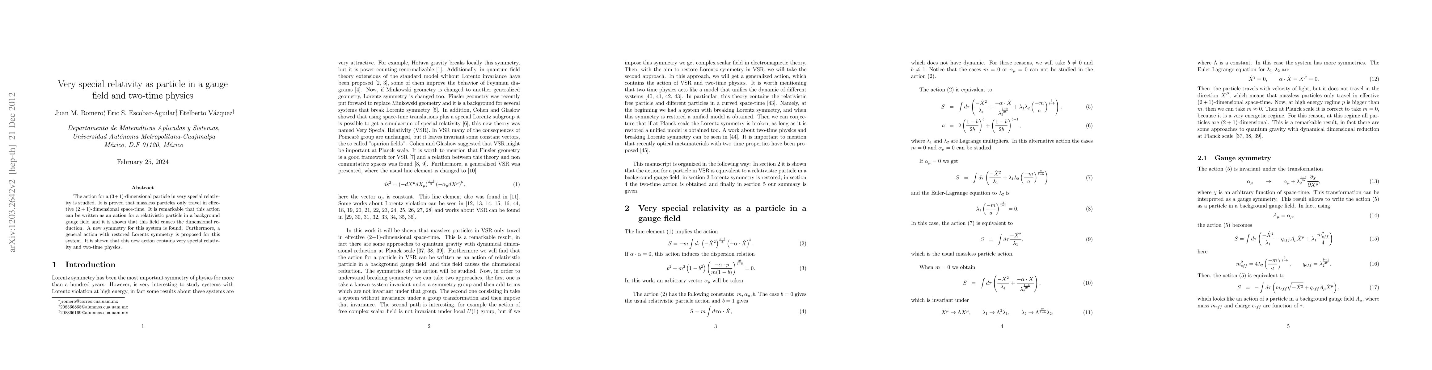 This paper explores the action for a particle in very special relativity, demonstrating that massless particles effectively travel in a $(2+1)$-dimensional space-time due to a gauge field. It introduces a new symmetry and proposes a general action that restores Lorentz symmetry, incorporating very special relativity and two-time physics.