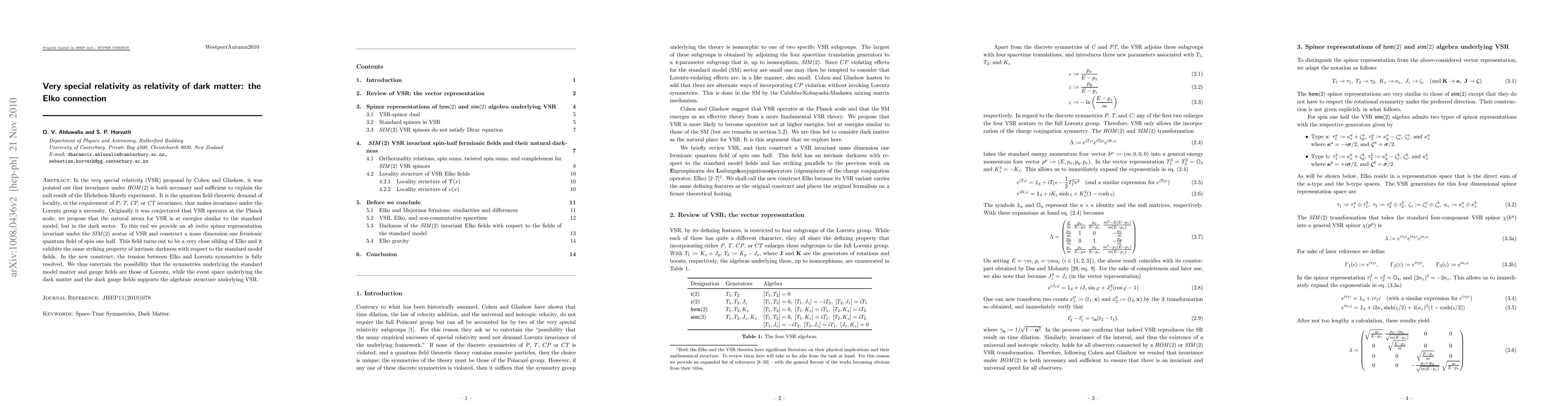 In the very special relativity (VSR) proposal by Cohen and Glashow, it was pointed out that invariance under HOM(2) is both necessary and sufficient to explain the null result of the Michelson-Morely experiment. It is the quantum field theoretic demand of locality, or the requirement of P, T, CP, or CT invariance, that makes invariance under the Lorentz group a necessity. Originally it was conjectured that VSR operates at the Planck scale; we propose that the natural arena for VSR is at energies similar to the standard model, but in the dark sector. To this end we provide an ab initio spinor representation invariant under the SIM(2) avatar of VSR and construct a mass dimension one fermionic quantum field of spin one half. This field turns out to be a very close sibling of Elko and it exhibits the same striking property of intrinsic darkness with respect to the standard model fields. In the new construct, the tension between Elko and Lorentz symmetries is fully resolved. We thus entertain the possibility that the symmetries underlying the standard model matter and gauge fields are those of Lorentz, while the event space underlying the dark matter and the dark gauge fields supports the algebraic structure underlying VSR.