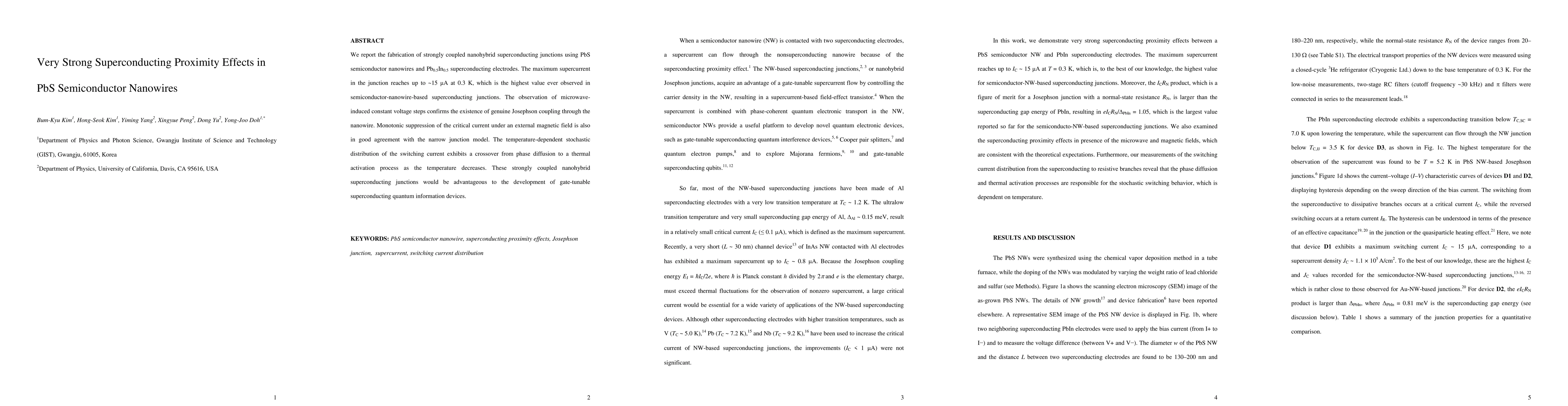 This paper reports the fabrication of highly efficient superconducting junctions using PbS semiconductor nanowires and Pb0.5In0.5 electrodes, achieving a maximum supercurrent of ~15 μA at 0.3 K. The study confirms genuine Josephson coupling and suggests potential for gate-tunable superconducting quantum information devices.