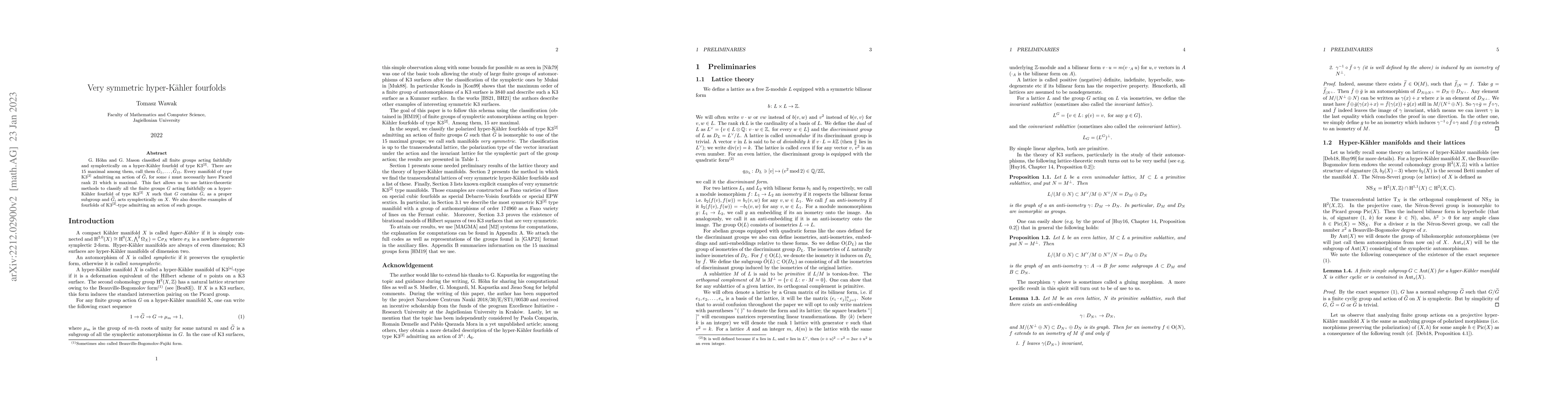 G. H\"ohn and G. Mason classified all finite groups acting faithfully and symplectically on a hyper-K{\"a}hler fourfolds of type K3$^{[2]}$. There are 15 maximal among them, call them $\widetilde{G}_1,\ldots, \widetilde{G}_{15}$. Every manifold of type K3$^{[2]}$ admitting an action of $\widetilde{G}_i$ for some $i$ must necessarily have Picard rank 21 which is maximal. This fact allows us to use lattice-theoretic methods to classify all the finite groups $G$ acting faithfully on a hyper-K{\"a}hler fourfold of type K3$^{[2]}$ $X$ such that $G$ contains $\widetilde{G}_i$ as a proper subgroup and $\widetilde{G}_i$ acts symplectically on $X$. We also describe examples of fourfolds of K3$^{[2]}$-type admitting an action of such groups.