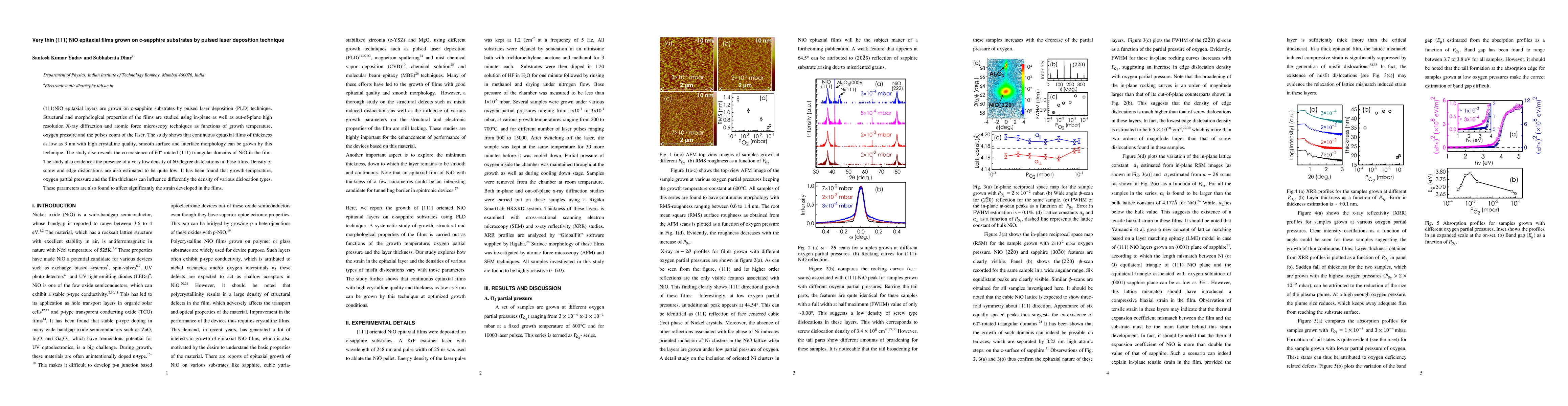 This paper investigates the growth of very thin (111) NiO epitaxial films on c-sapphire substrates using pulsed laser deposition, finding high-quality continuous films with low dislocation densities influenced by growth parameters. High-resolution XRD and AFM reveal smooth morphology and low strain due to optimal conditions.