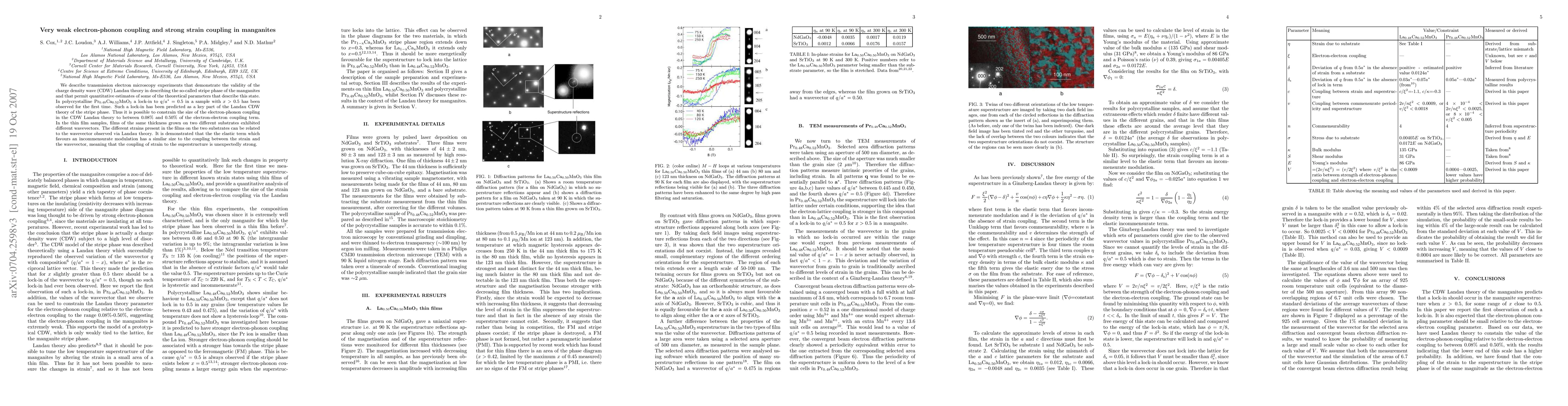The coupling of the manganite stripe phase to the lattice and to strain has been investigated via transmission electron microscopy studies of polycrystalline and thin film manganites. In polycrystalline \PCMOfiftwo a lockin to $q/a^*=0.5$ in a sample with $x>0.5$ has been observed for the first time. Such a lockin has been predicted as a key part of the Landau CDW theory of the stripe phase. Thus it is possible to constrain the size of the electron-phonon coupling in the CDW Landau theory to between 0.04% and 0.05% of the electron-electron coupling term. In the thin film samples, films of the same thickness grown on two different substrates exhibited different wavevectors. The different strains present in the films on the two substrates can be related to the wavevector observed via Landau theory. It is demonstrated that the the elastic term which favours an incommensurate modulation has a similar size to the coupling between the strain and the wavevector, meaning that the coupling of strain to the superlattice is unexpectedly strong.