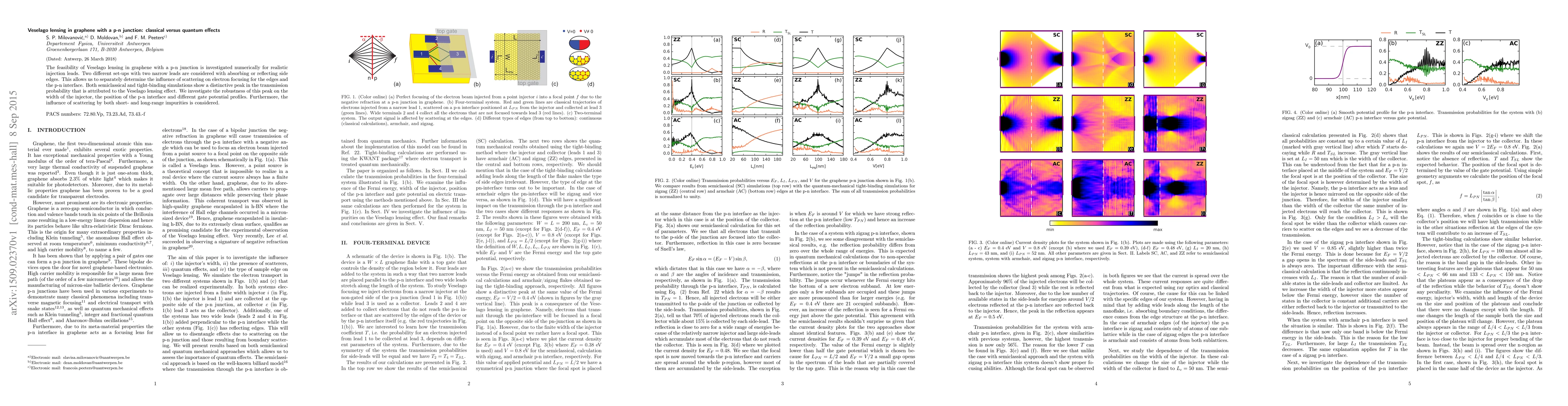This paper investigates Veselago lensing in graphene with a p-n junction using both semiclassical and quantum simulations, finding a peak in transmission probability due to lensing effects. The study examines the impact of scattering, junction width, interface position, and impurity types on this effect.
