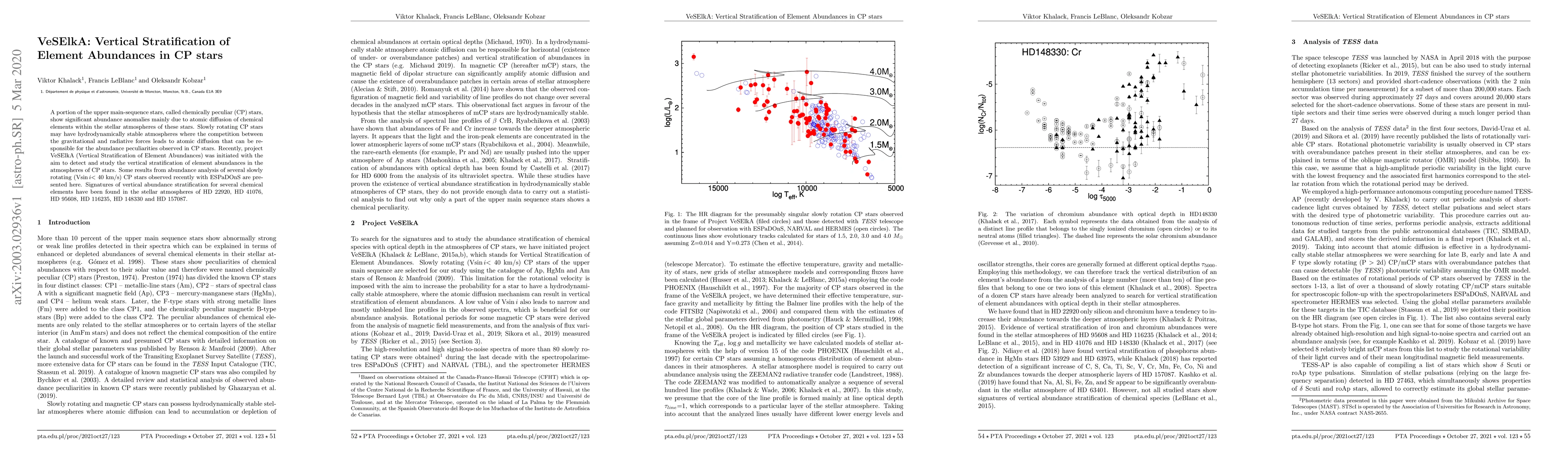 The VeSElkA project aims to study vertical stratification of element abundances in CP stars, revealing significant abundance anomalies due to atomic diffusion. Initial findings from ESPaDOnS observations indicate vertical stratification signatures in the atmospheres of several slowly rotating CP stars.