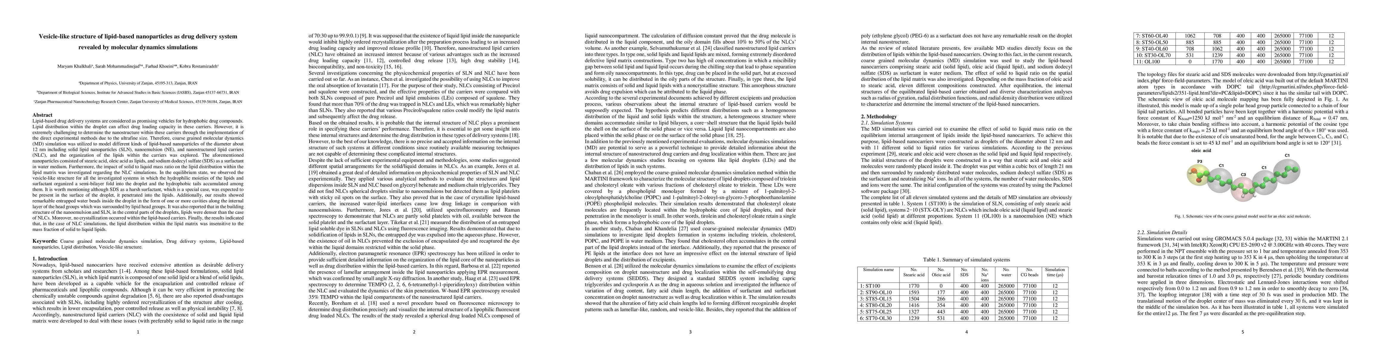 This research utilizes coarse-grained molecular dynamics simulations to explore the vesicle-like structures of lipid-based nanoparticles, including SLN, NE, and NLC, revealing a semi-bilayer organization with hydrophilic moieties forming the outer layer and hydrophobic tails clustering internally. The study also highlights the impact of solid to liquid mass ratios on lipid distribution, particularly noting the insensitivity of NLCs to these ratios.