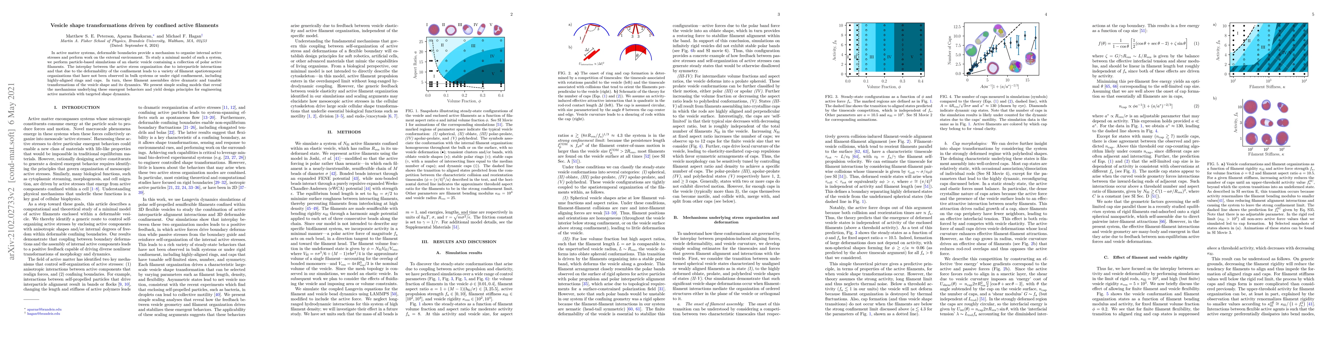 In active matter systems, deformable boundaries provide a mechanism to organize internal active stresses and perform work on the external environment. To study a minimal model of such a system, we perform particle-based simulations of an elastic vesicle containing a collection of polar active filaments. The interplay between the active stress organization due to interparticle interactions and that due to the deformability of the confinement leads to a variety of filament spatiotemporal organizations that have not been observed in bulk systems or under rigid confinement, including highly-aligned rings and caps. In turn, these filament assemblies drive dramatic and tunable transformations of the vesicle shape and its dynamics. We present simple scaling models that reveal the mechanisms underlying these emergent behaviors and yield design principles for engineering active materials with targeted shape dynamics.