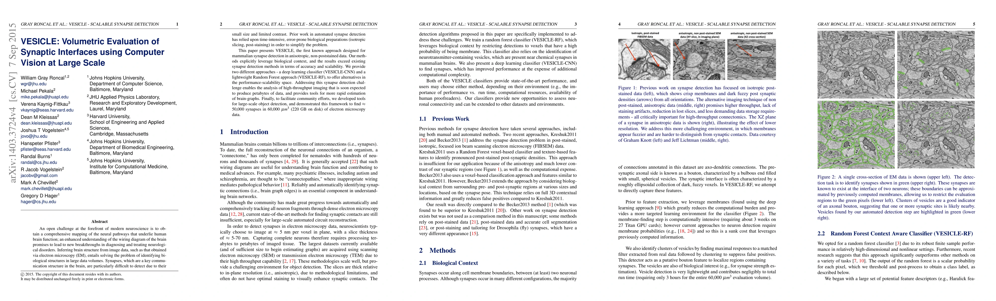 An open challenge problem at the forefront of modern neuroscience is to obtain a comprehensive mapping of the neural pathways that underlie human brain function; an enhanced understanding of the wiring diagram of the brain promises to lead to new breakthroughs in diagnosing and treating neurological disorders. Inferring brain structure from image data, such as that obtained via electron microscopy (EM), entails solving the problem of identifying biological structures in large data volumes. Synapses, which are a key communication structure in the brain, are particularly difficult to detect due to their small size and limited contrast. Prior work in automated synapse detection has relied upon time-intensive biological preparations (post-staining, isotropic slice thicknesses) in order to simplify the problem. This paper presents VESICLE, the first known approach designed for mammalian synapse detection in anisotropic, non-post-stained data. Our methods explicitly leverage biological context, and the results exceed existing synapse detection methods in terms of accuracy and scalability. We provide two different approaches - one a deep learning classifier (VESICLE-CNN) and one a lightweight Random Forest approach (VESICLE-RF) to offer alternatives in the performance-scalability space. Addressing this synapse detection challenge enables the analysis of high-throughput imaging data soon expected to reach petabytes of data, and provide tools for more rapid estimation of brain-graphs. Finally, to facilitate community efforts, we developed tools for large-scale object detection, and demonstrated this framework to find $\approx$ 50,000 synapses in 60,000 $\mu m ^3$ (220 GB on disk) of electron microscopy data.