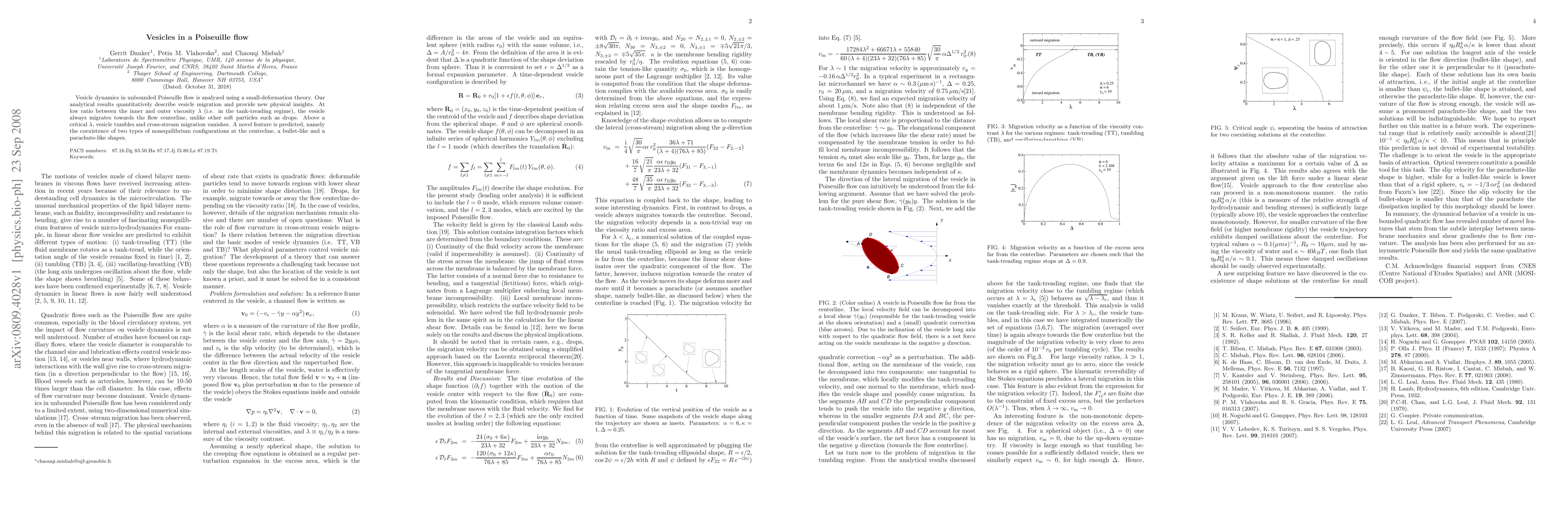 This paper analyzes vesicle dynamics in Poiseuille flow using small-deformation theory, revealing that vesicles migrate towards the flow centerline in the tank-treading regime. Above a critical viscosity ratio, vesicles tumble and cease cross-stream migration, with a novel prediction of two distinct nonequilibrium shapes at the centerline.