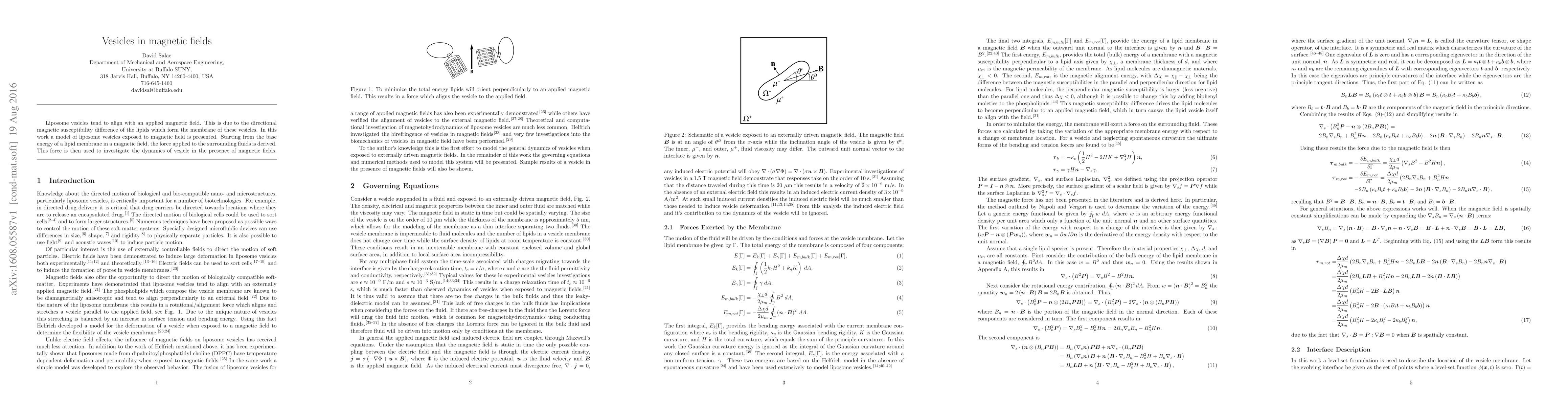 This paper presents a model for liposome vesicles aligning with magnetic fields due to lipid membrane's directional magnetic susceptibility, deriving the force applied to surrounding fluids and investigating the resulting vesicle dynamics.