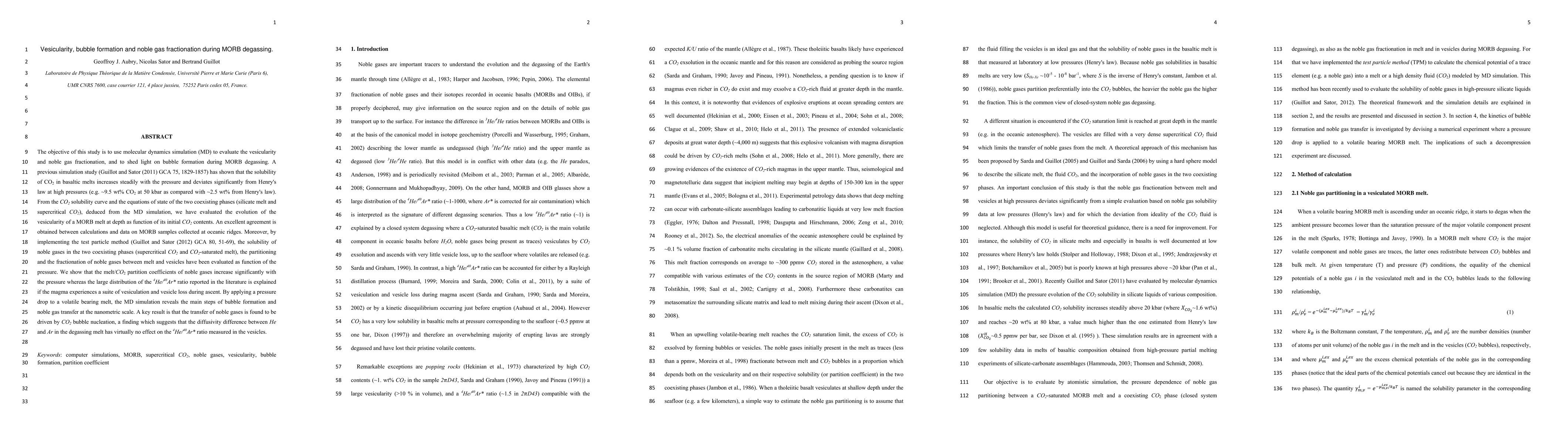 This study employs molecular dynamics (MD) simulations to investigate MORB degassing, focusing on vesicularity, bubble formation, and noble gas fractionation. The research utilizes a force field developed by Guillot and Sator (2011) to model CO2 incorporation into silicate melts.