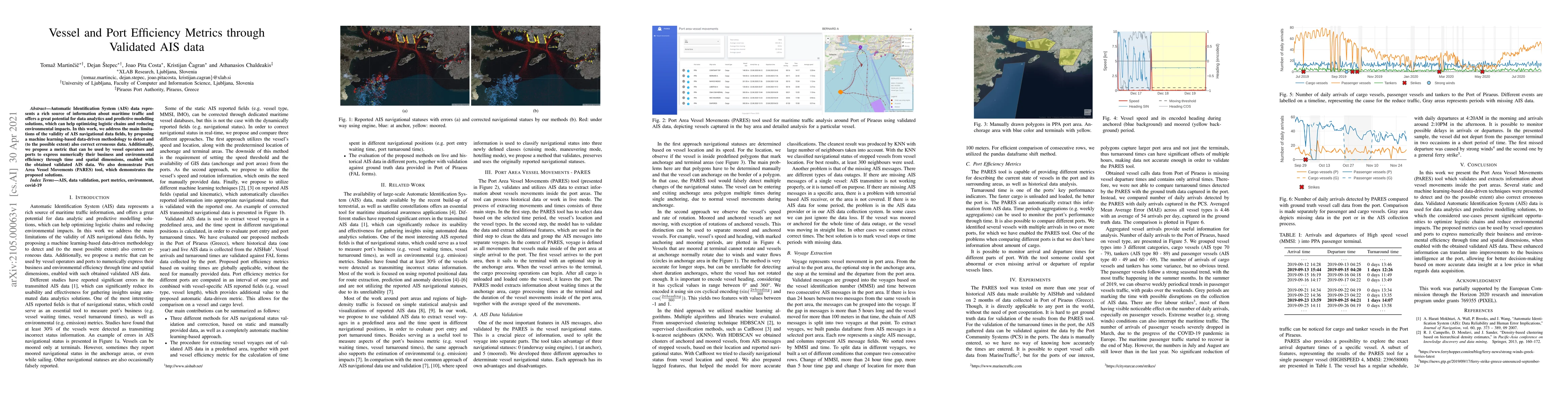 Automatic Identification System (AIS) data represents a rich source of information about maritime traffic and offers a great potential for data analytics and predictive modeling solutions, which can help optimizing logistic chains and to reduce environmental impacts. In this work, we address the main limitations of the validity of AIS navigational data fields, by proposing a machine learning-based data-driven methodology to detect and (to the possible extent) also correct erroneous data. Additionally, we propose a metric that can be used by vessel operators and ports to express numerically their business and environmental efficiency through time and spatial dimensions, enabled with the obtained validated AIS data. We also demonstrate Port Area Vessel Movements (PARES) tool, which demonstrates the proposed solutions.