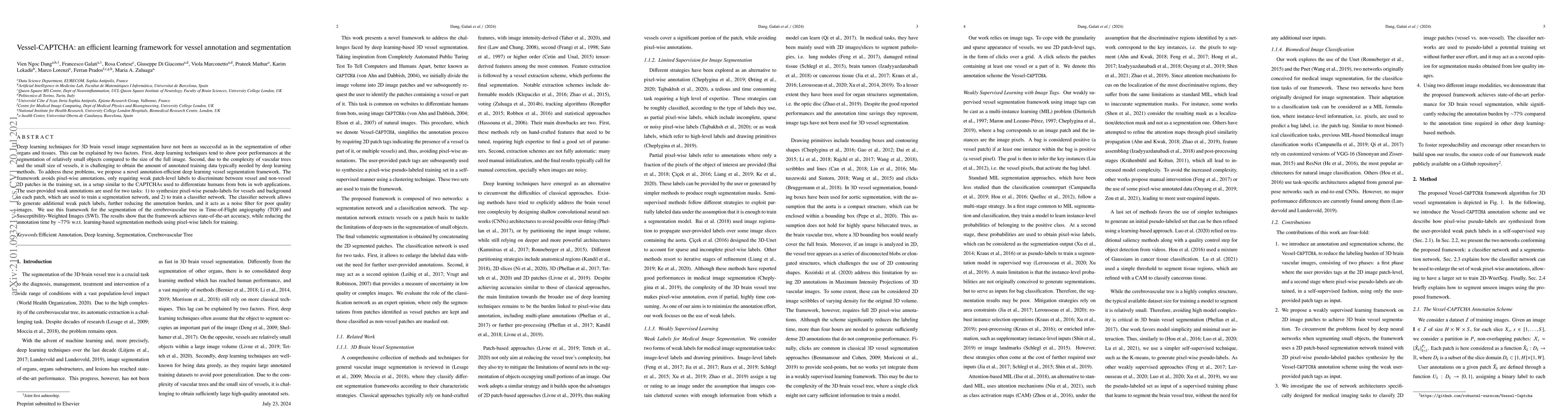 The paper introduces Vessel-CAPTCHA, an efficient deep learning framework for vessel segmentation that reduces annotation effort by using weak patch-level labels instead of pixel-wise annotations. This approach synthesizes pseudo-labels and trains both a segmentation and a classifier network, achieving state-of-the-art accuracy in cerebrovascular tree segmentation with a 77% reduction in annotation time.