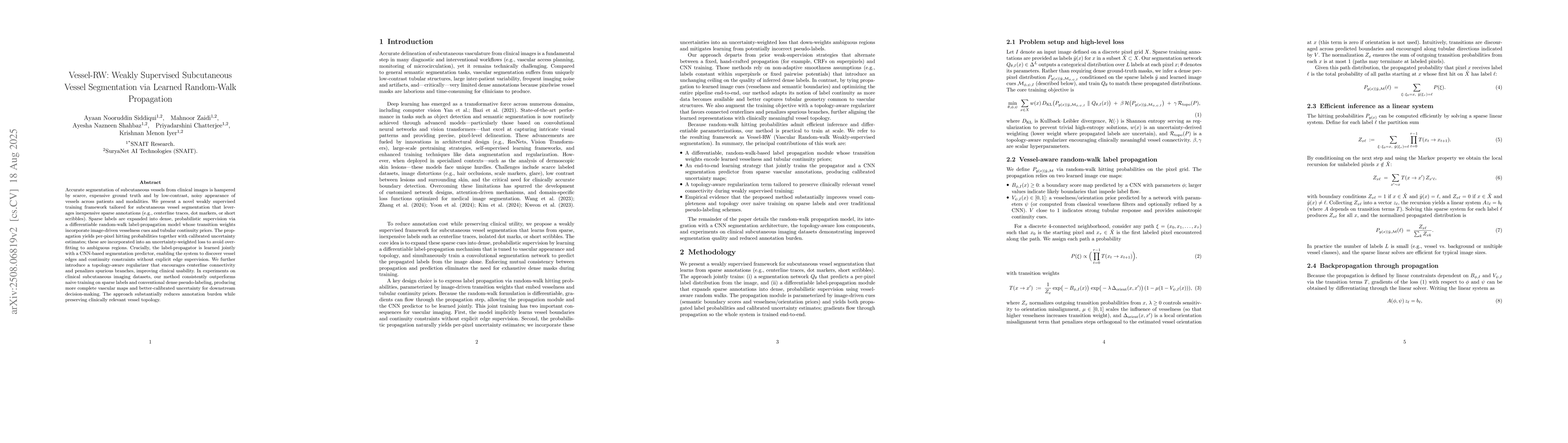 The task of parsing subcutaneous vessels in clinical images is often hindered by the high cost and limited availability of ground truth data, as well as the challenge of low contrast and noisy vessel appearances across different patients and imaging modalities. In this work, we propose a novel weakly supervised training framework specifically designed for subcutaneous vessel segmentation. This method utilizes low-cost, sparse annotations such as centerline traces, dot markers, or short scribbles to guide the learning process. These sparse annotations are expanded into dense probabilistic supervision through a differentiable random walk label propagation model, which integrates vesselness cues and tubular continuity priors driven by image data. The label propagation process results in per-pixel hitting probabilities and uncertainty estimates, which are incorporated into an uncertainty-weighted loss function to prevent overfitting in ambiguous areas. Notably, the label propagation model is trained jointly with a CNN-based segmentation network, allowing the system to learn vessel boundaries and continuity constraints without the need for explicit edge supervision. Additionally, we introduce a topology-aware regularizer that encourages centerline connectivity and penalizes irrelevant branches, further enhancing clinical applicability. Our experiments on clinical subcutaneous imaging datasets demonstrate that our approach consistently outperforms both naive sparse-label training and traditional dense pseudo-labeling methods, yielding more accurate vascular maps and better-calibrated uncertainty, which is crucial for clinical decision-making. This method significantly reduces the annotation workload while maintaining clinically relevant vessel topology.