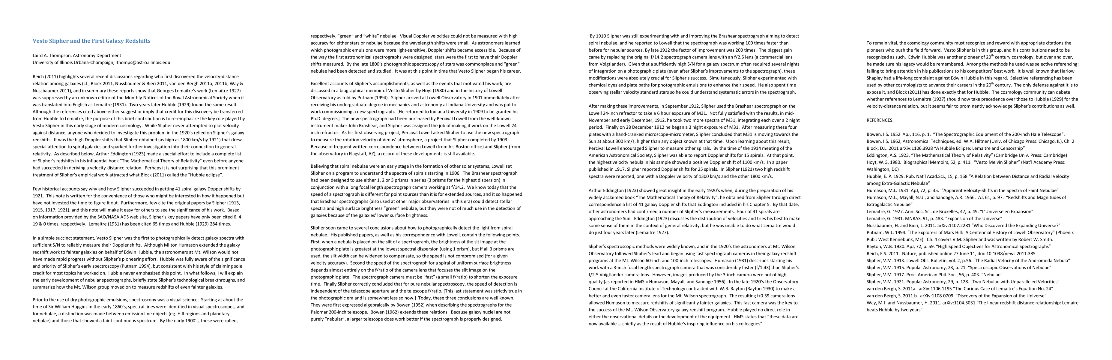 Priority in the discovery of the velocity-distance relationship may be shifting from Edwin Hubble to Georges Lemaitre, but any reassessment of credit must also consider the contributions of Vesto Slipher. Not only were his spiral galaxy redshifts a necessary component in all of the original velocity-distance plots, but it was the quest to explain these unprecedentedly large Doppler velocities that pointed the way to a new physical interpretation.