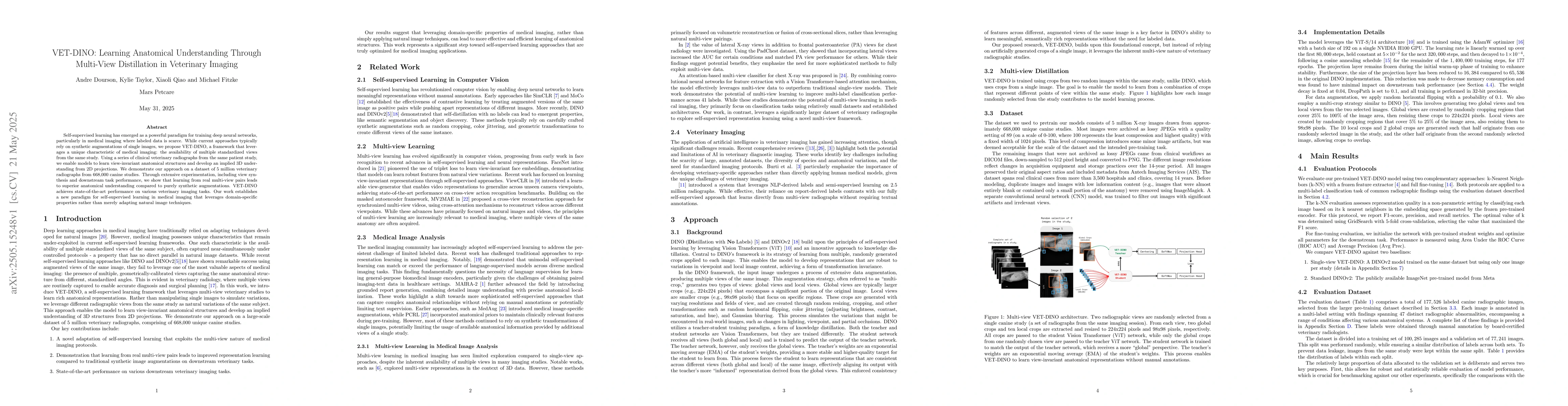 The research proposes VET-DINO, a self-supervised learning framework for deep neural networks using multiple standardized views from the same patient study in veterinary radiographs, enabling view-invariant anatomical structure learning and 3D understanding from 2D projections.