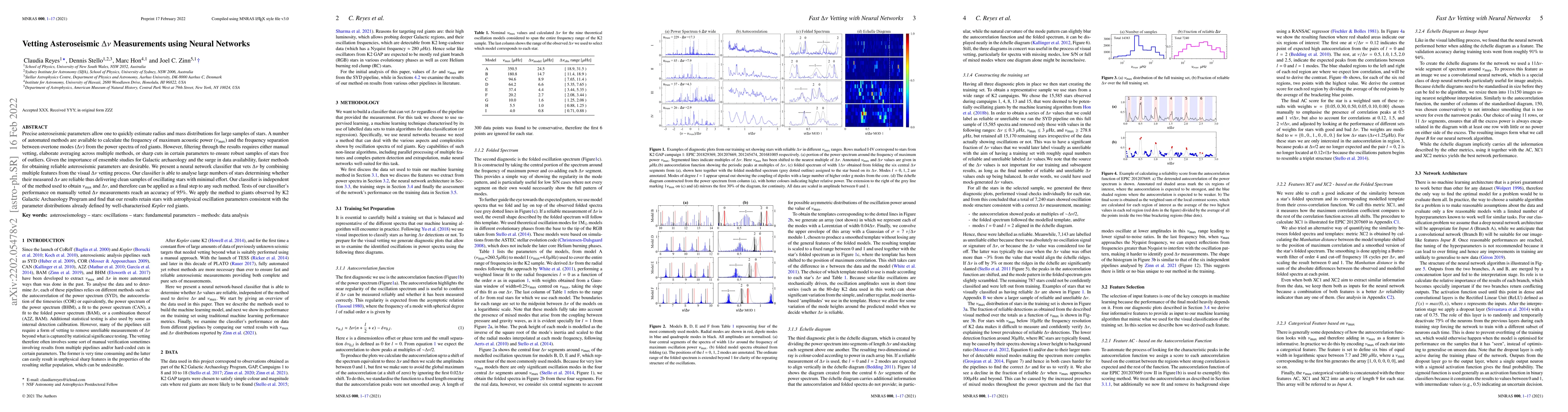 Precise asteroseismic parameters allow one to quickly estimate radius and mass distributions for large samples of stars. A number of automated methods are available to calculate the frequency of maximum acoustic power ($\nu_{\mathrm{max}}$) and the frequency separation between overtone modes ($\Delta\nu$) from the power spectra of red giants. However, filtering through the results requires either manual vetting, elaborate averaging across multiple methods, or sharp cuts in certain parameters to ensure robust samples of stars free of outliers. Given the importance of ensemble studies for Galactic archaeology and the surge in data availability, faster methods for obtaining reliable asteroseismic parameters are desirable. We present a neural network classifier that vets $\Delta\nu$ by combining multiple features from the visual $\Delta\nu$ vetting process. Our classifier is able to analyse large numbers of stars determining whether their measured $\Delta\nu$ are reliable thus delivering clean samples of oscillating stars with minimal effort. Our classifier is independent of the method used to obtain $\nu_{\mathrm{max}}$ and $\Delta\nu$, and therefore can be applied as a final step to any such method. Tests of our classifier's performance on manually vetted $\Delta\nu$ measurements reach an accuracy of 95%. We apply the method to giants observed by K2 Galactic Archaeology Program and find that our results retain stars with astrophysical oscillation parameters consistent with the parameter distributions already defined by well-characterised Kepler red giants.
