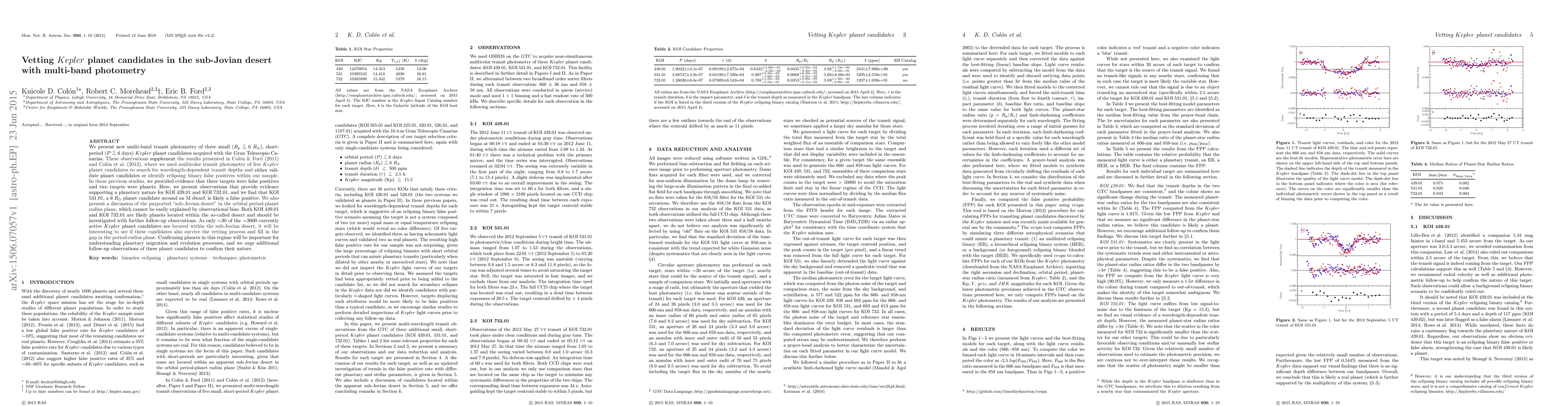 This paper uses multi-band transit photometry to vet three small, short-period Kepler planet candidates, confirming the planetary nature of KOI 439.01 and KOI 732.01 while identifying KOI 531.01 as a false positive, and discusses the significance of the "sub-Jovian desert" in the orbital period-planet radius plane.