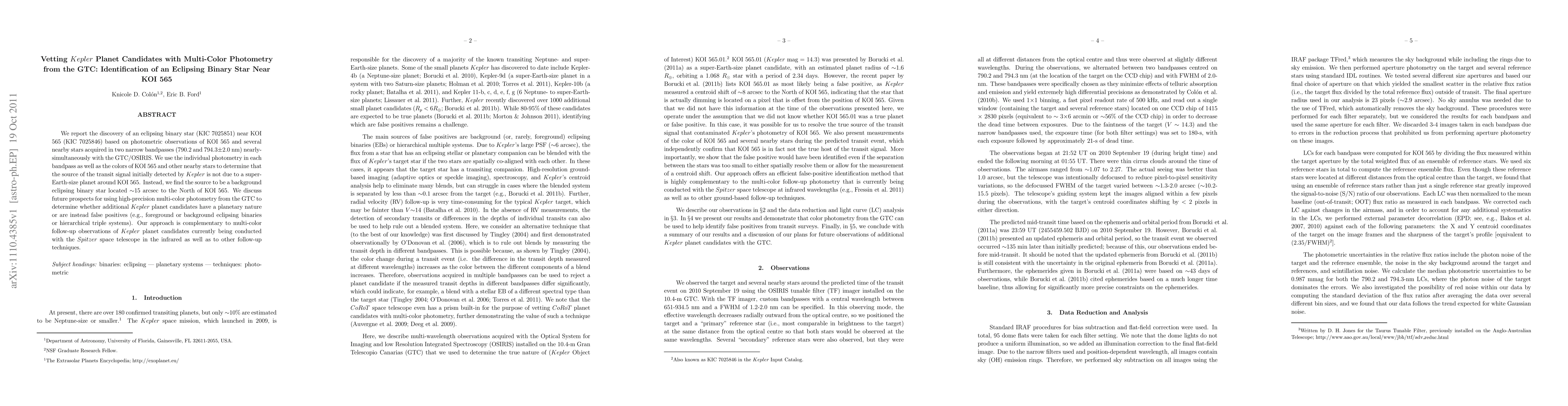 This paper identifies an eclipsing binary star (KIC 7025851) near KOI 565 using multi-color photometry from the GTC, revealing that the initial transit signal was not from a planet but from a background eclipsing binary. The study suggests using similar high-precision multi-color observations to verify the planetary nature of additional Kepler candidates.